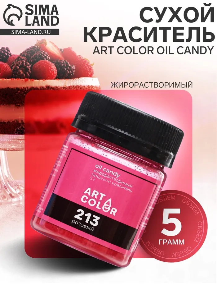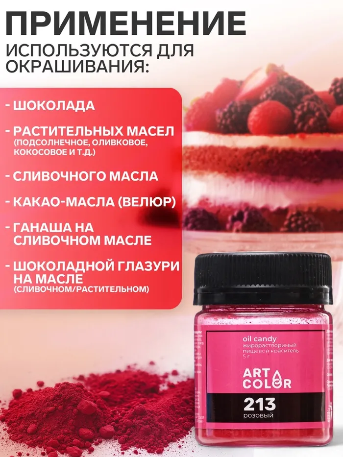 Сухой краситель от Art Color Oil - это пищевой жирорастворимый сухой краситель для профессионального использования. Сферы применения - пищевые продукты: шоколад, шоколадная глазурь, какао-масло, масляный крем, велюр, зеркальная глазурь, ганаш, дизайн корпусных конфет и и шоколадных фигурок; творчество: мыло ручной работы.