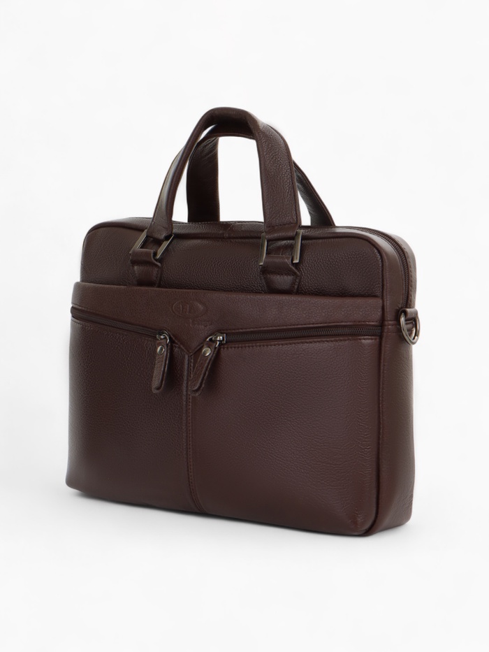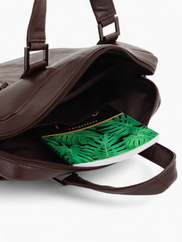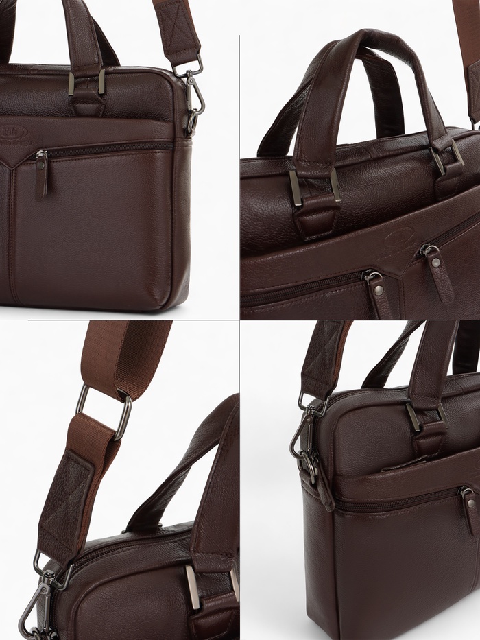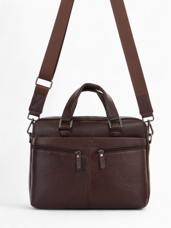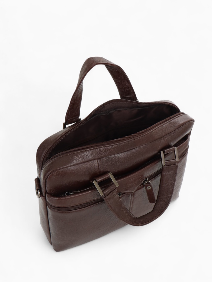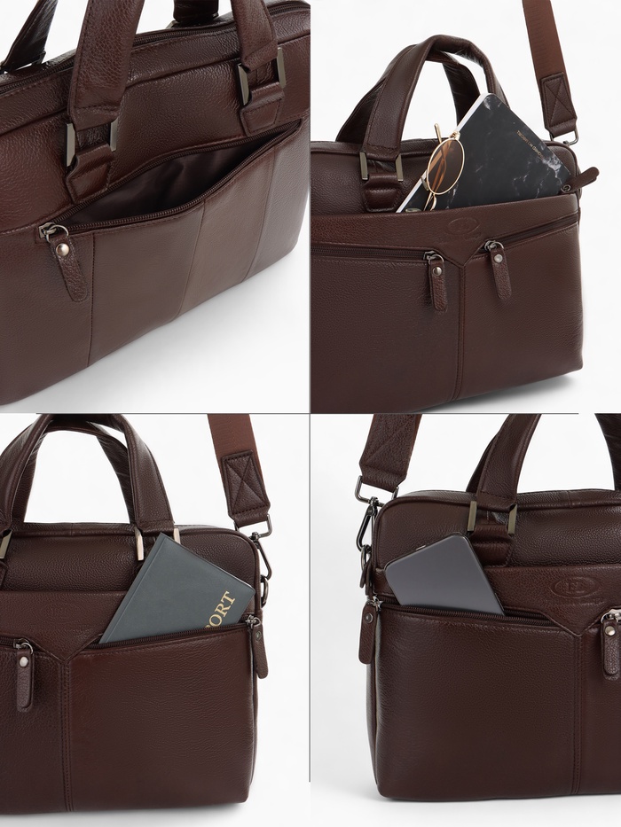 Коричневая кожаная сумка для документов — классический аксессуар для делового стиля. Натуральная кожа с полукаркасной конструкцией сохраняет форму, оставаясь удобной в ежедневном использовании. Вместительное основное отделение с молнией и два дополнительных кармана помогают организовать рабочие документы и необходимые мелочи.