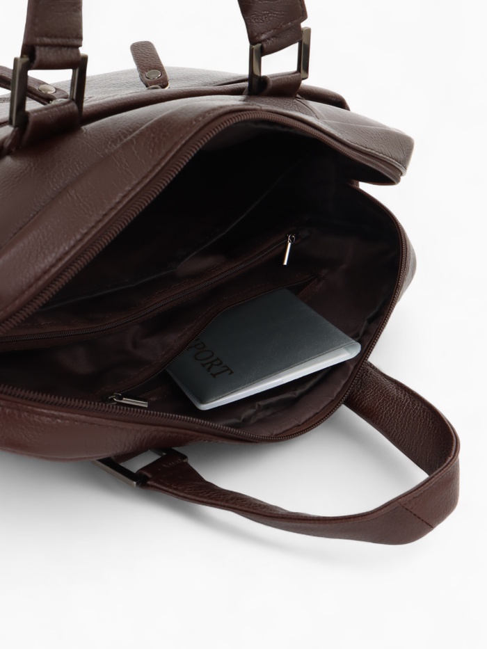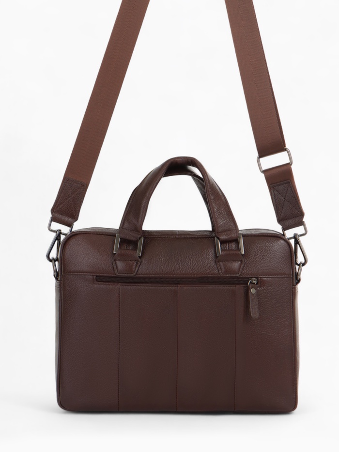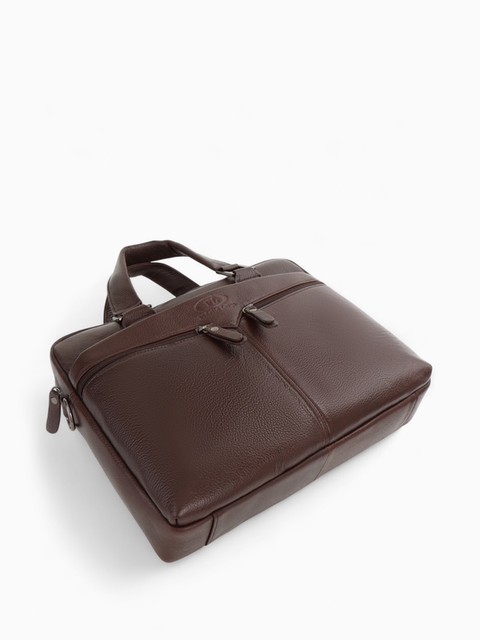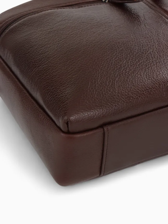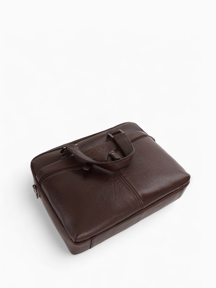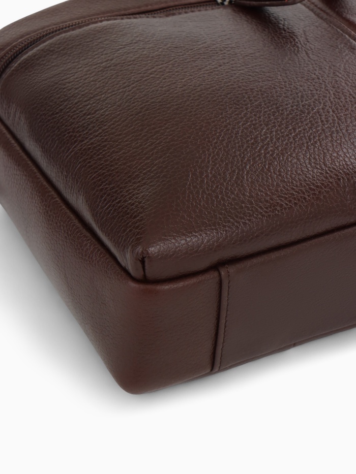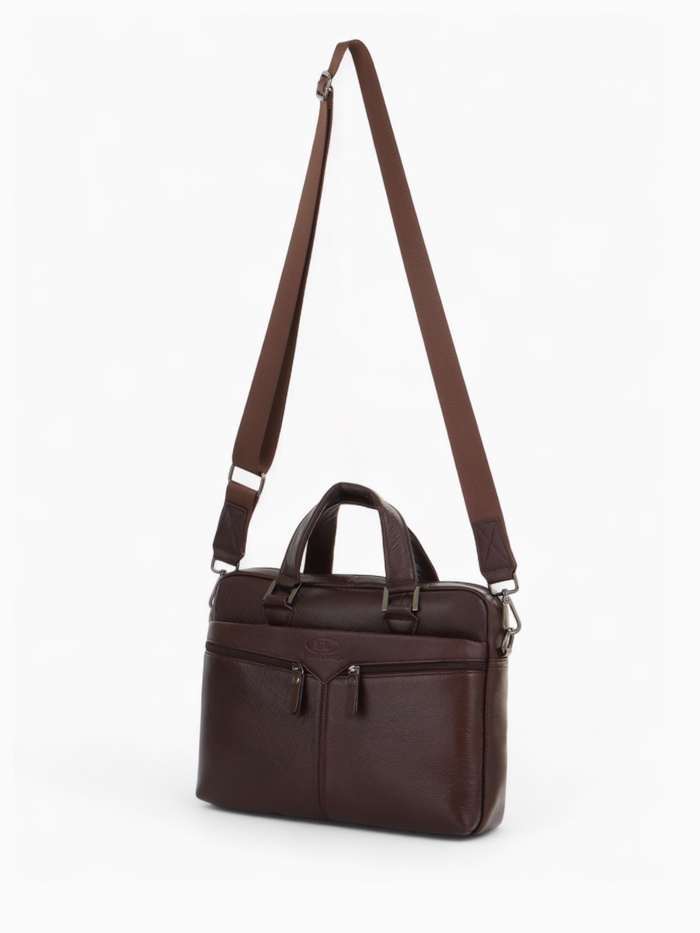 Коричневая кожаная сумка для документов — классический аксессуар для делового стиля. Натуральная кожа с полукаркасной конструкцией сохраняет форму, оставаясь удобной в ежедневном использовании. Вместительное основное отделение с молнией и два дополнительных кармана помогают организовать рабочие документы и необходимые мелочи.