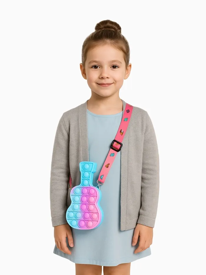 Цветная сумочка для девочек открывает мир стильных игр и увлекательных прогулок! Эта компактная и яркая модель станет лучшей подругой для малышек, начиная с трехлетнего возраста. Изготовленная из силикона, сумочка сочетает в себе игру Поп ит и практичность. Захватывающее занятие — Поп ит — можно взять с собой в повседневность, где он превращается в оригинальный аксессуар.