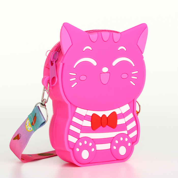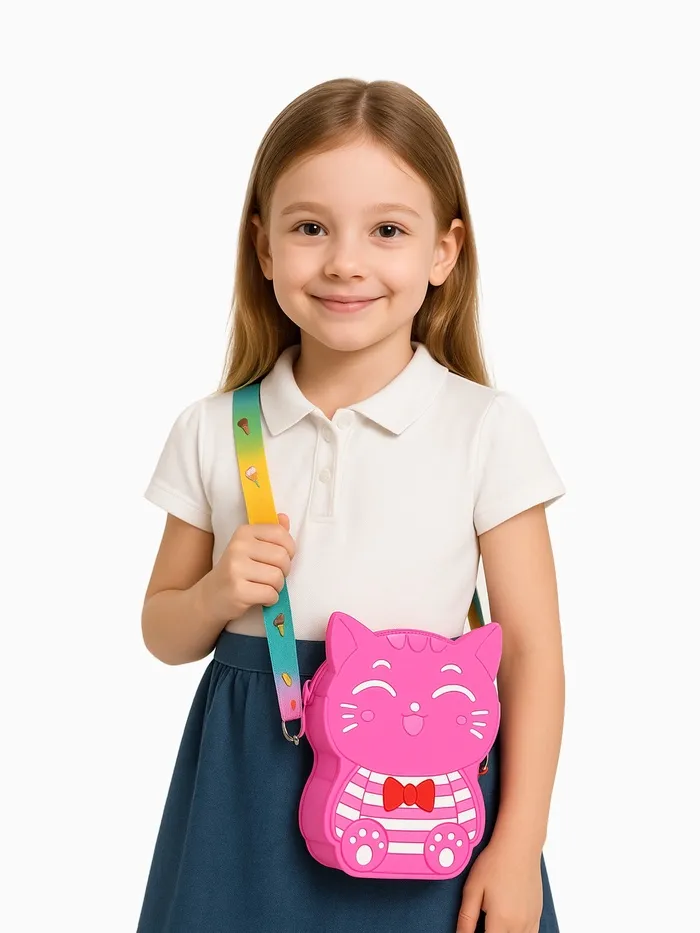 С этой сумкой девочка всегда найдёт чем заняться — можно носить свои сокровища или просто играть с антистрессовой поверхностью. Регулируемый ремень обеспечивает удобную посадку на любом росте. Нежный розовый цвет и забавный котик делают аксессуар желанным подарком. Это практичное решение для развития мелкой моторики и формирования собственного стиля.