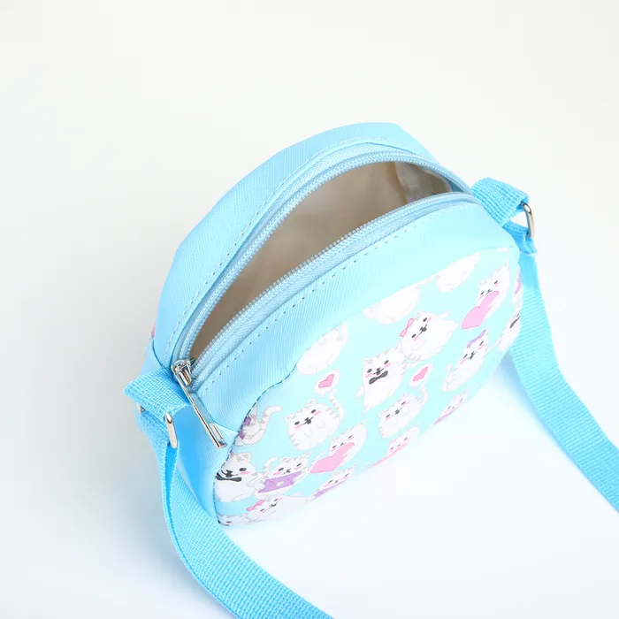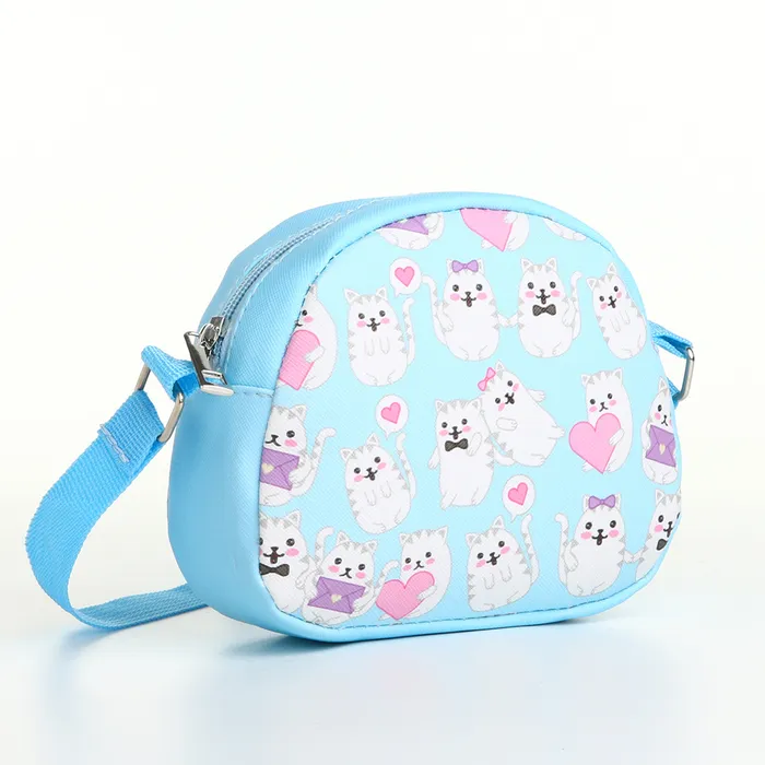 Эта голубая сумка через плечо с милыми котятами станет любимым аксессуаром для девочки. Нежный цвет и забавный рисунок поднимают настроение, а удобная молния надёжно защищает содержимое. Регулируемый ремень позволяет носить её на плече или через плечо, как у взрослых.