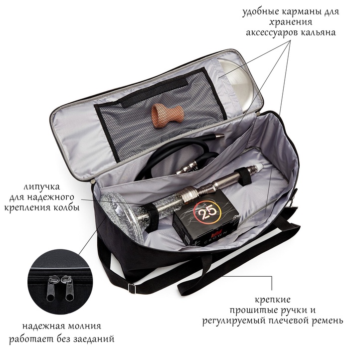 - Дополнительная защита: Плотный материал защищает кальян от внешних воздействий и повреждений.