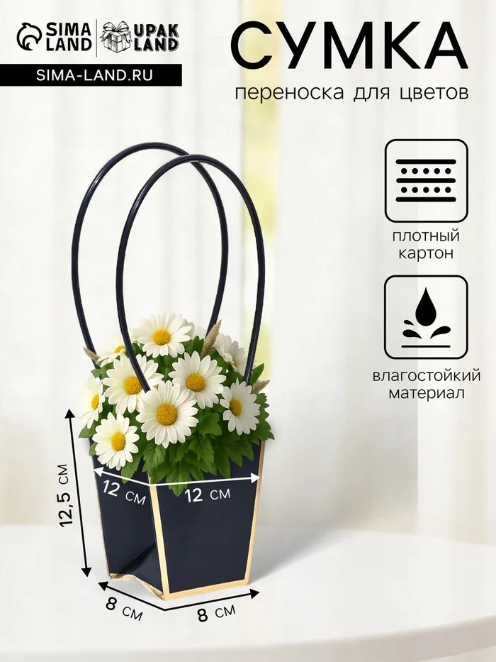 Элегантная водостойкая сумка для цветов — идеальное решение для стильной и удобной упаковки букетов и композиций. Изготовлена из плотного влагостойкого картона, надежно защищает цветы от влаги и деформации. Удобные длинные ручки позволяют легко переносить композицию.
