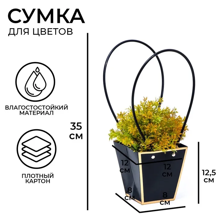 Сумка для цветов «Чёрная», с тиснением, влагостойкая, 12×12 - 8×8 - 12.5 см — Характеристики
