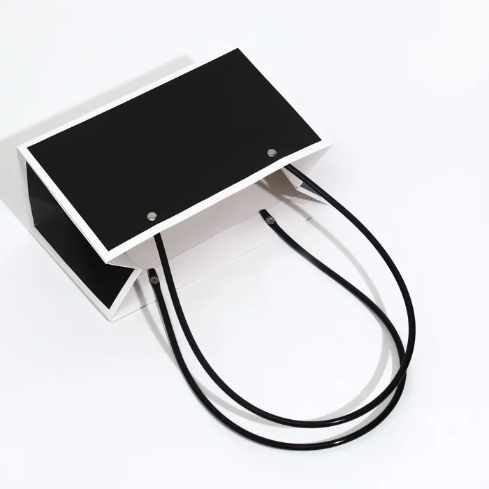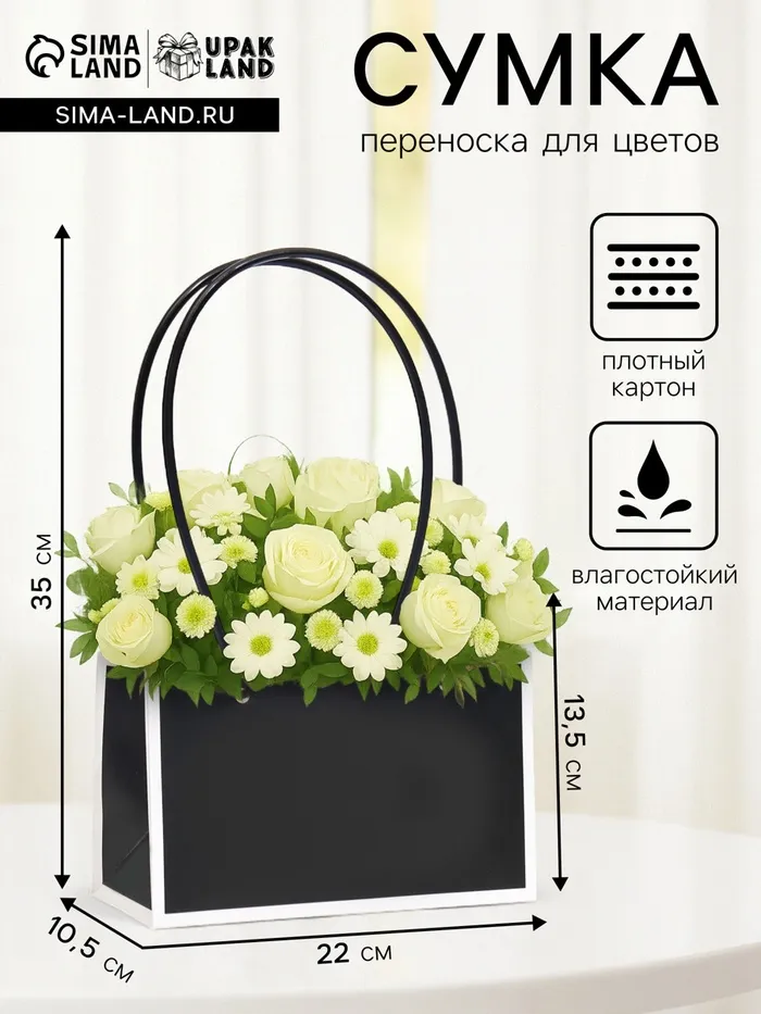 Элегантная водостойкая сумка для цветов — идеальное решение для стильной и удобной упаковки букетов и композиций. Изготовлена из плотного влагостойкого картона, надежно защищает цветы от влаги и деформации. Удобные длинные ручки позволяют легко переносить композицию.