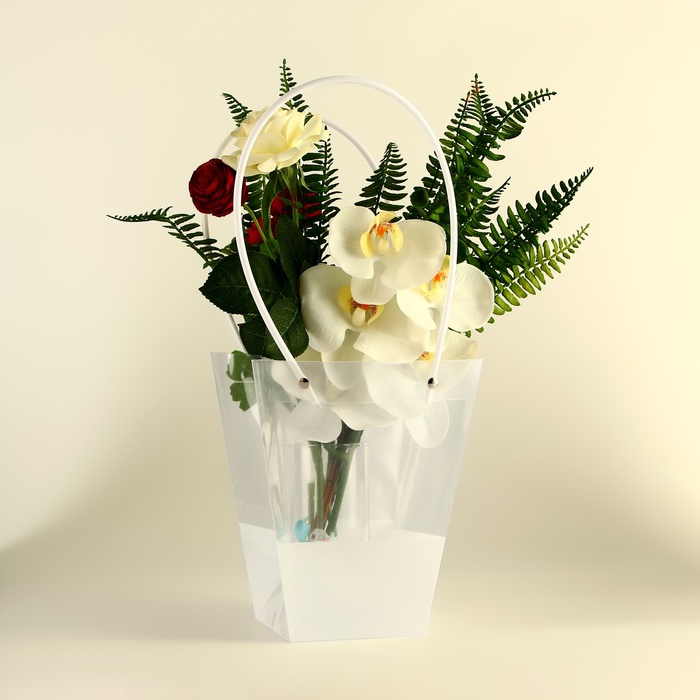 Размеры 20х17х10 см делают её удобной для транспортировки, а аккуратные ручки обеспечивают комфорт при переноске. Прозрачные стенки подчёркивают естественную красоту цветов, создавая ощущение лёгкости и воздушности. Сумка отлично подходит для небольших композиций, монобукетов или цветочных горшков.