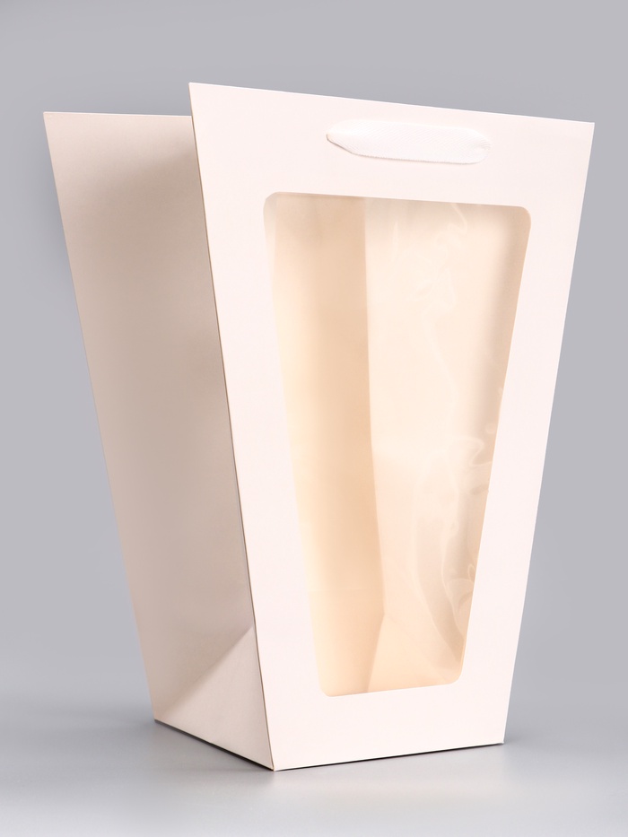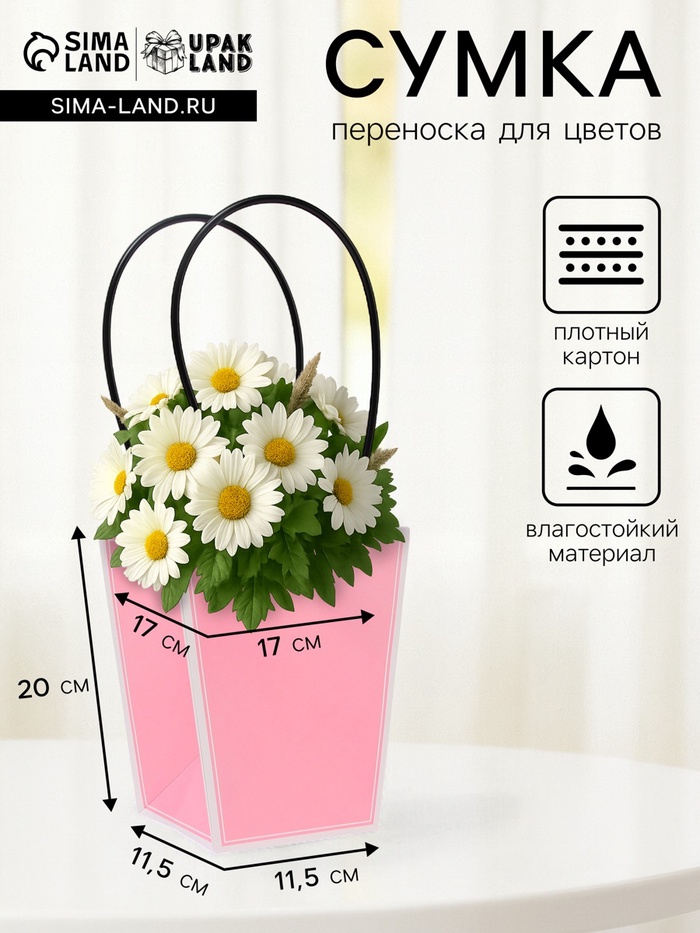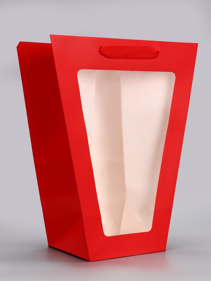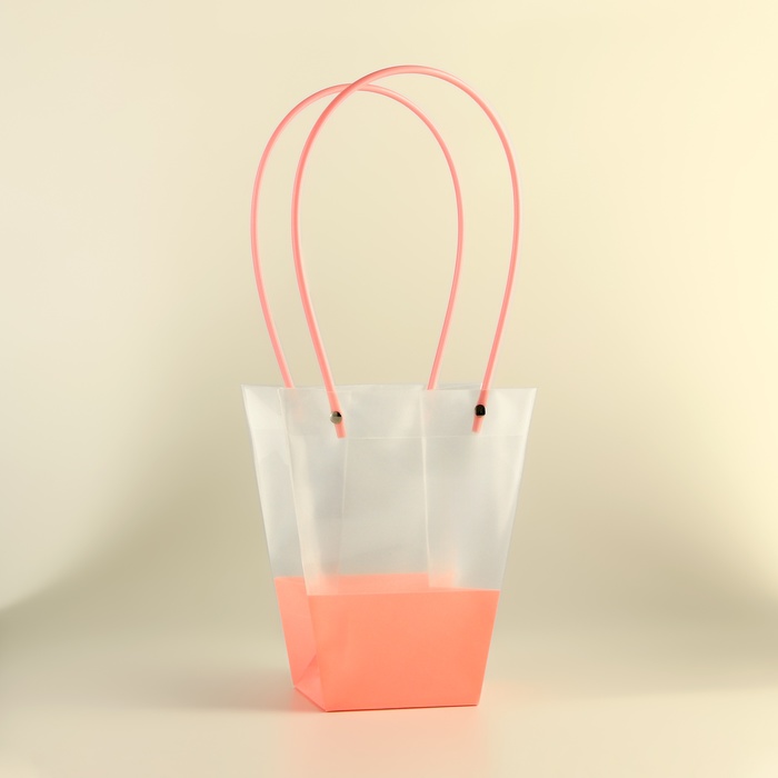 Размеры 20х17х10 см делают её удобной для транспортировки, а аккуратные ручки обеспечивают комфорт при переноске. Прозрачные стенки подчёркивают естественную красоту цветов, создавая ощущение лёгкости и воздушности. Сумка отлично подходит для небольших композиций, монобукетов или цветочных горшков.