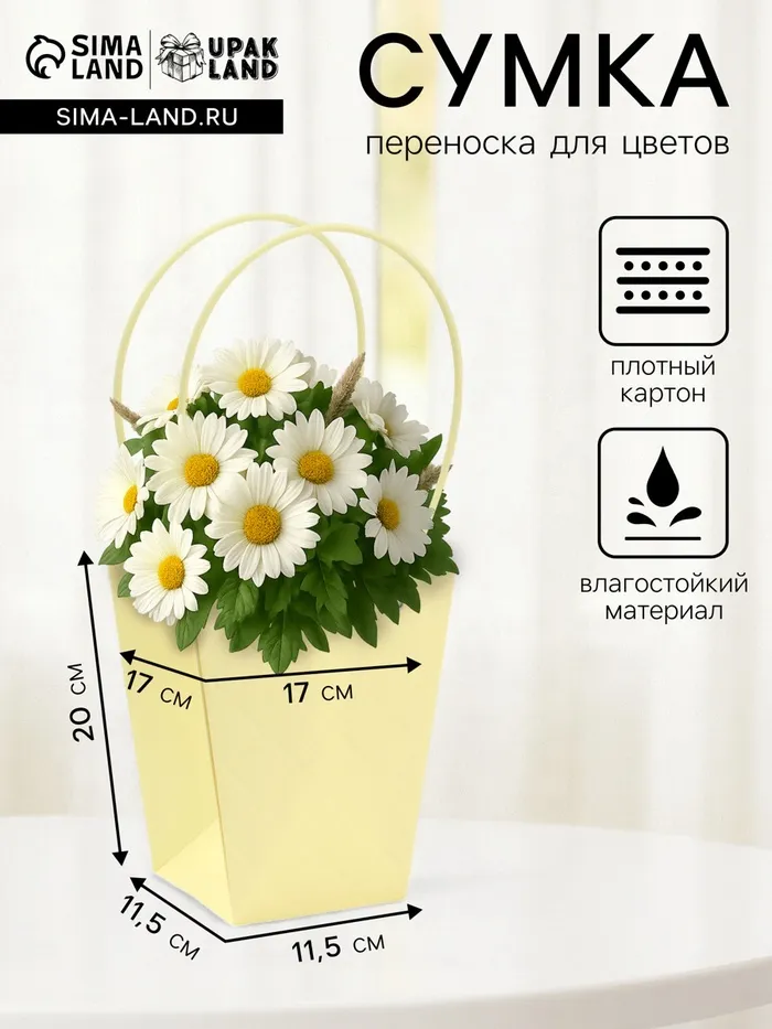 Элегантная водостойкая сумка для цветов — идеальное решение для стильной и удобной упаковки букетов и композиций. Изготовлена из плотного влагостойкого картона, надежно защищает цветы от влаги и деформации. Удобные длинные ручки позволяют легко переносить композицию.