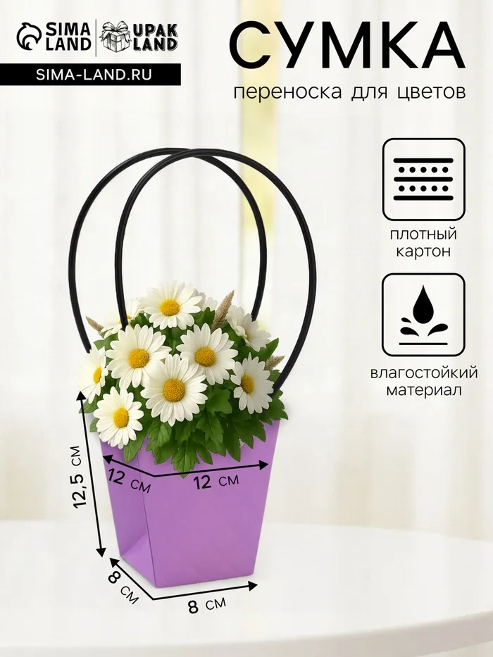 Элегантная водостойкая сумка для цветов — идеальное решение для стильной и удобной упаковки букетов и композиций. Изготовлена из плотного влагостойкого картона, надежно защищает цветы от влаги и деформации. Удобные длинные ручки позволяют легко переносить композицию.