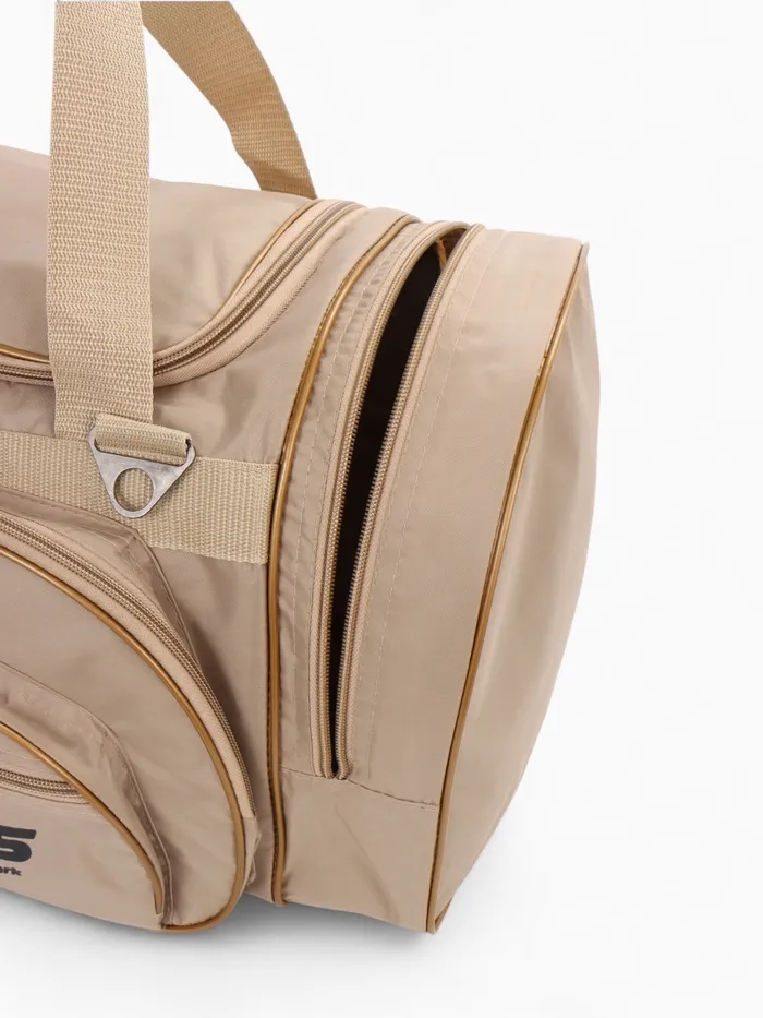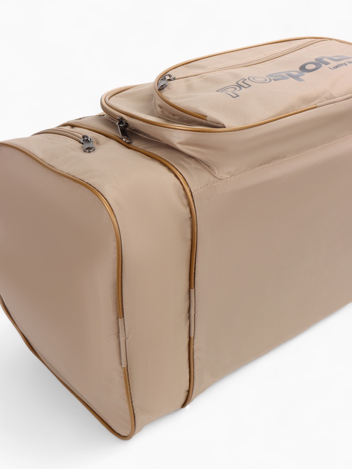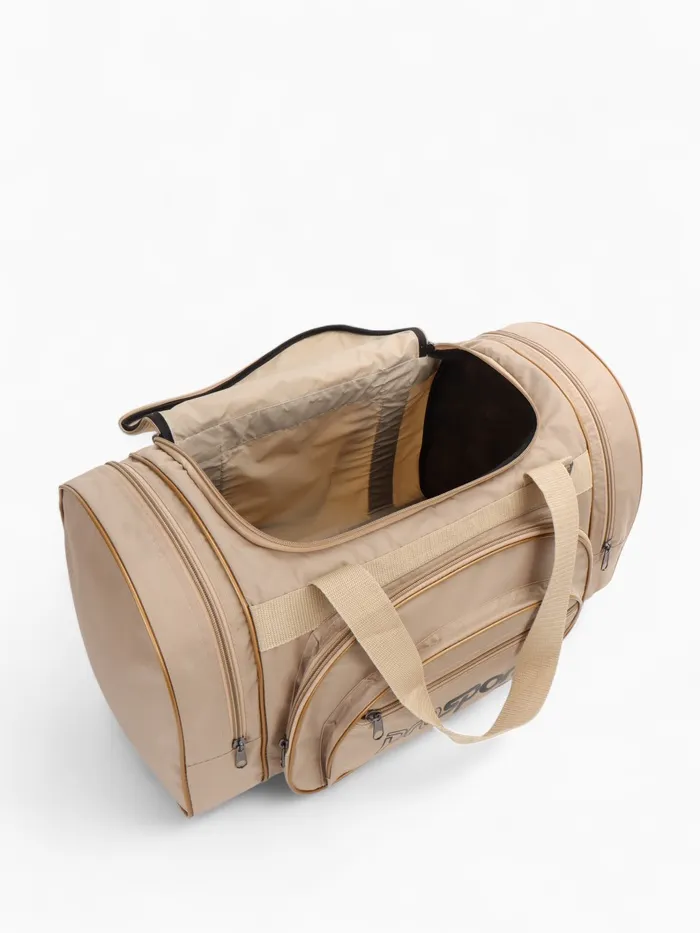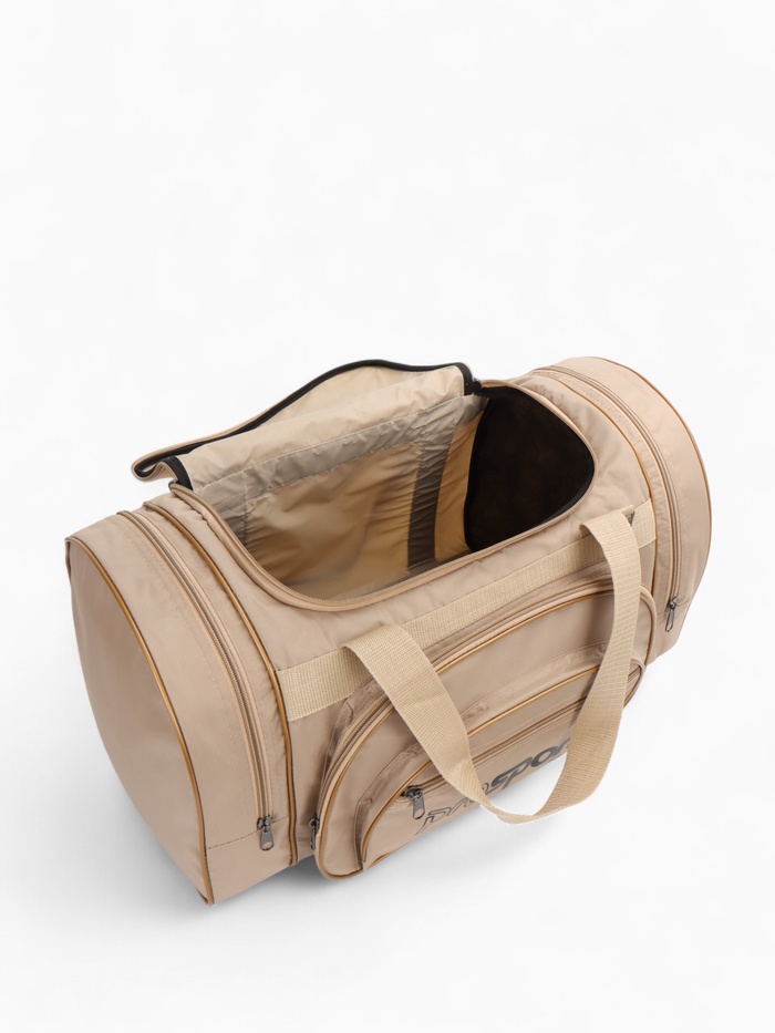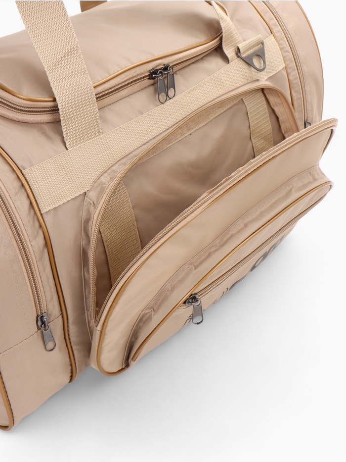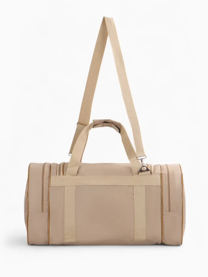Эта бежевая дорожная сумка сочетает в себе практичность и стиль городского аксессуара. Её вместительный объем подходит для непродолжительных поездок или использования в качестве основной сумки в путешествии.