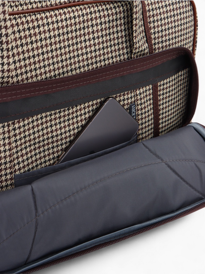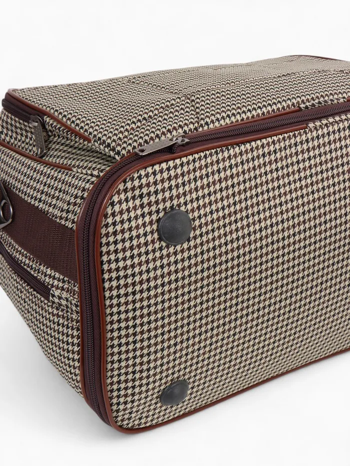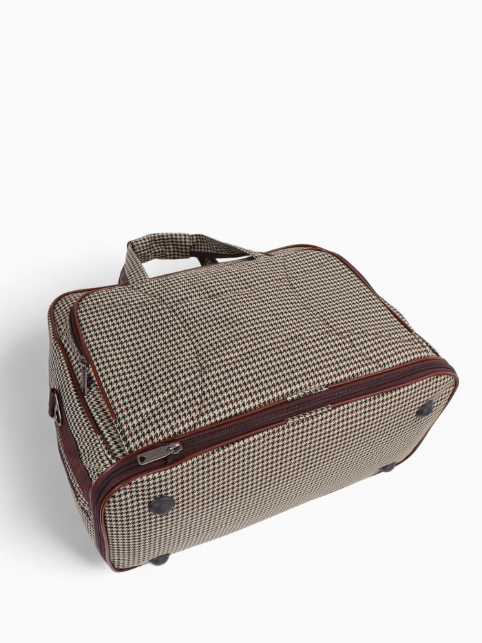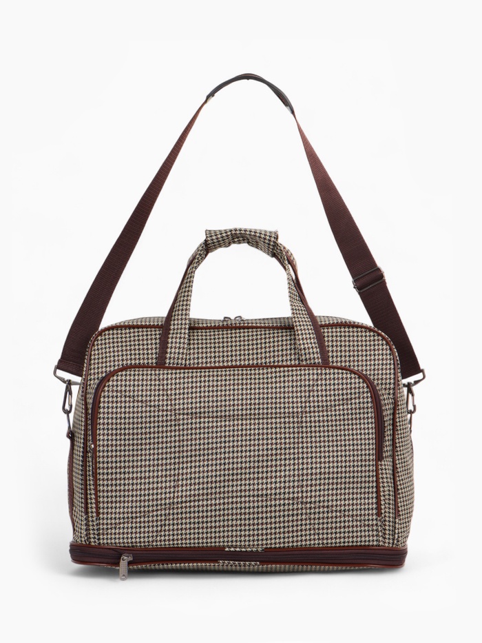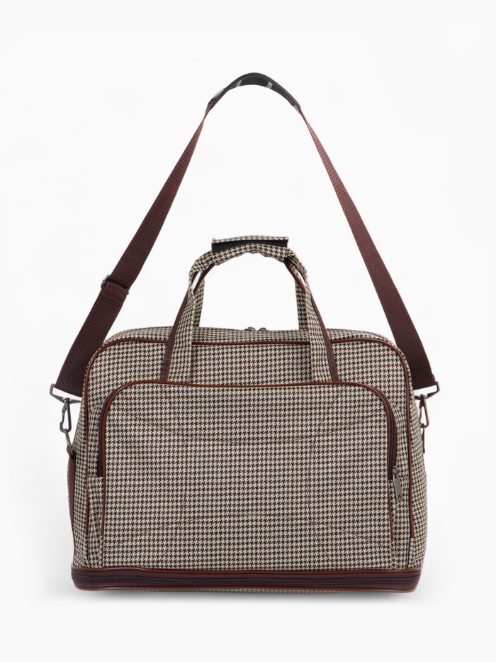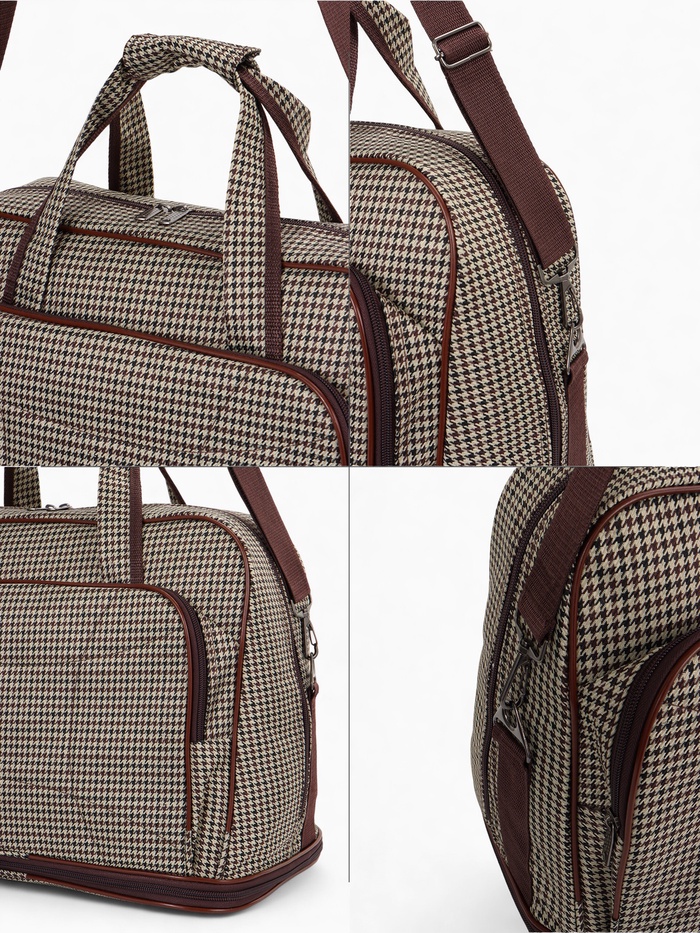 Элегантная сумка с узором "гусиная лапка" сочетает классический бежево-коричневый дизайн с современной функциональностью. Длинный регулируемый ремень обеспечивает комфортное ношение, а система увеличения объёма до 33 литров адаптируется под ваши потребности.