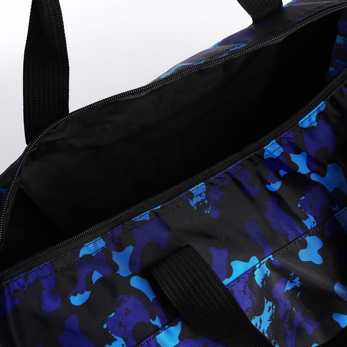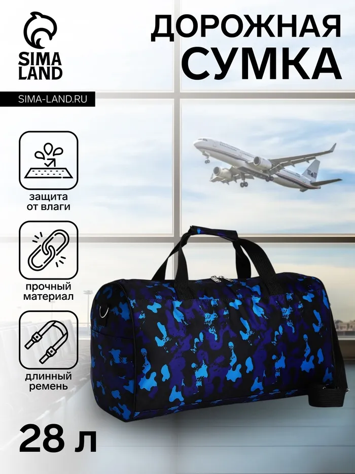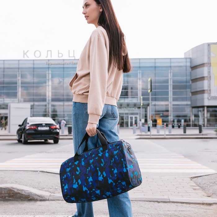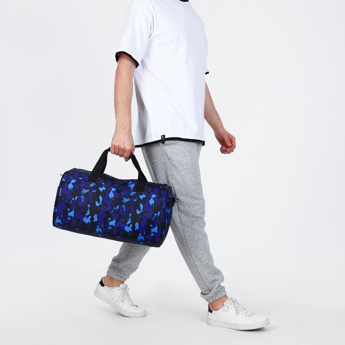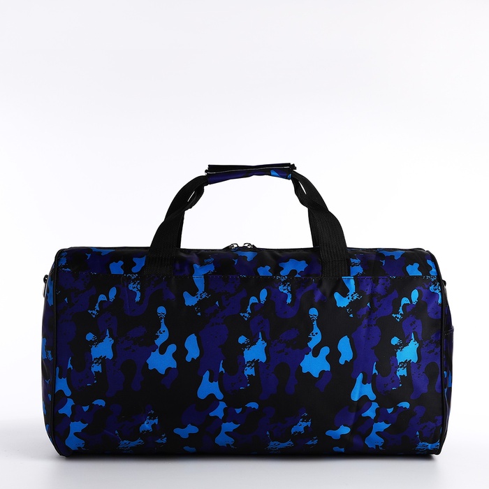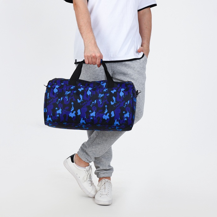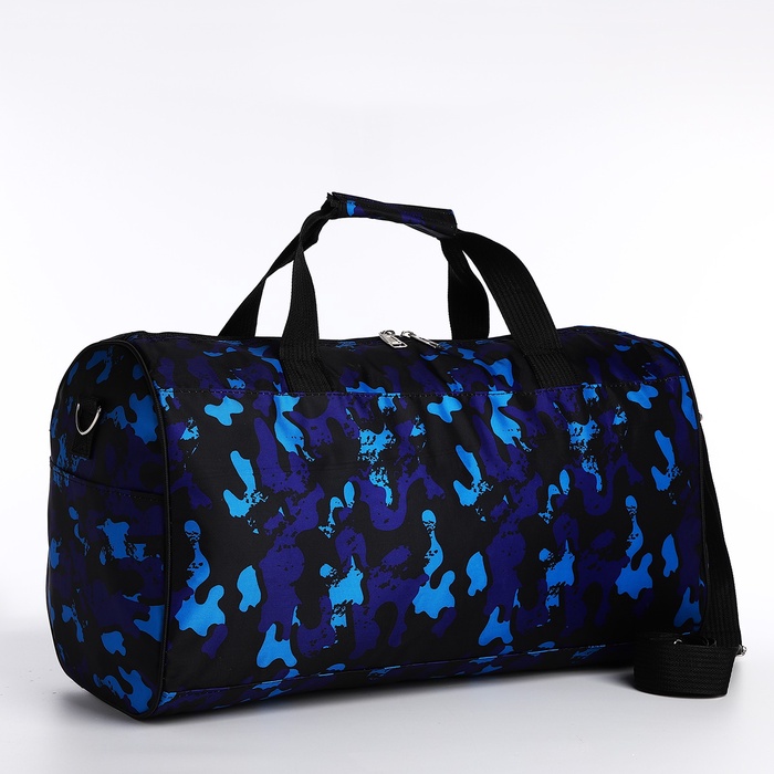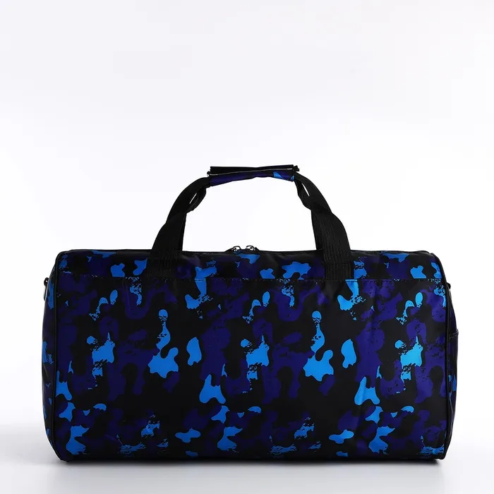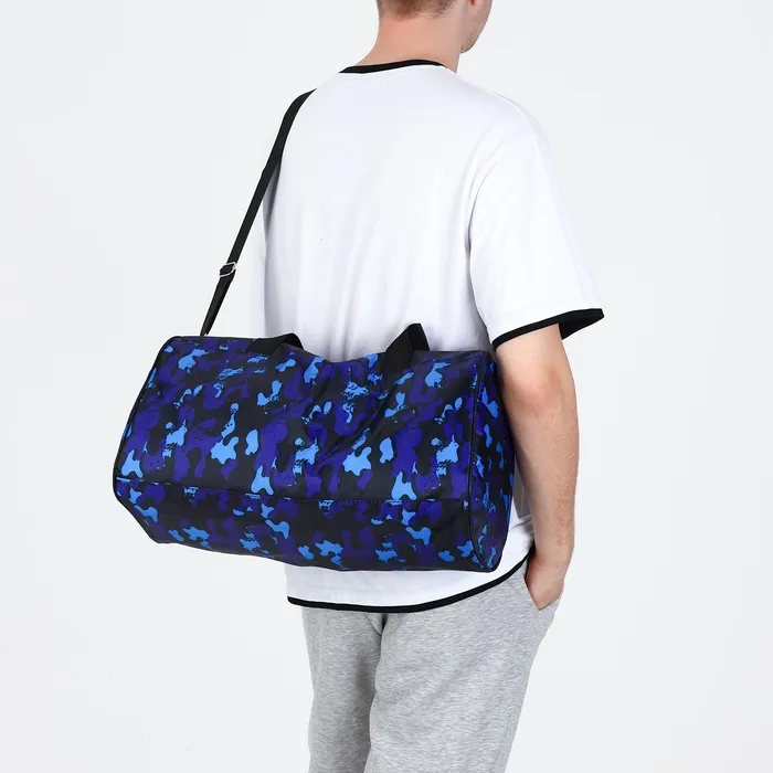 Сумка дорожная среднего размера с рисунком в камуфляжной тематике, выполненная из прочного полиэстера. Эта вместительная модель в синем и чёрном цветах будет вашим надежным спутником в путешествиях. Закрывается на молнию, имеет одно главное отделение и наружный карман для удобного размещения мелких предметов. Благодаря длинному ремню и эргономичному дизайну, сумку удобно носить с собой, не испытывая дискомфорта. Подходит для использования в унисекс-формате. Идеальный выбор как для поездок на природу, так и в городской среде.