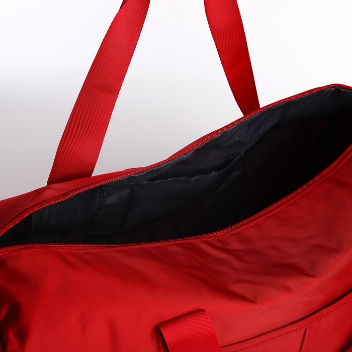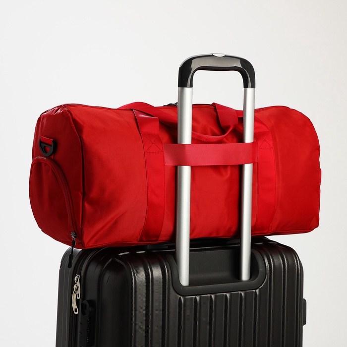 Сумка дорожная на молнии, отдел для обуви, наружный карман, держатель для чемодана, длинный ремень, красная — Характеристики