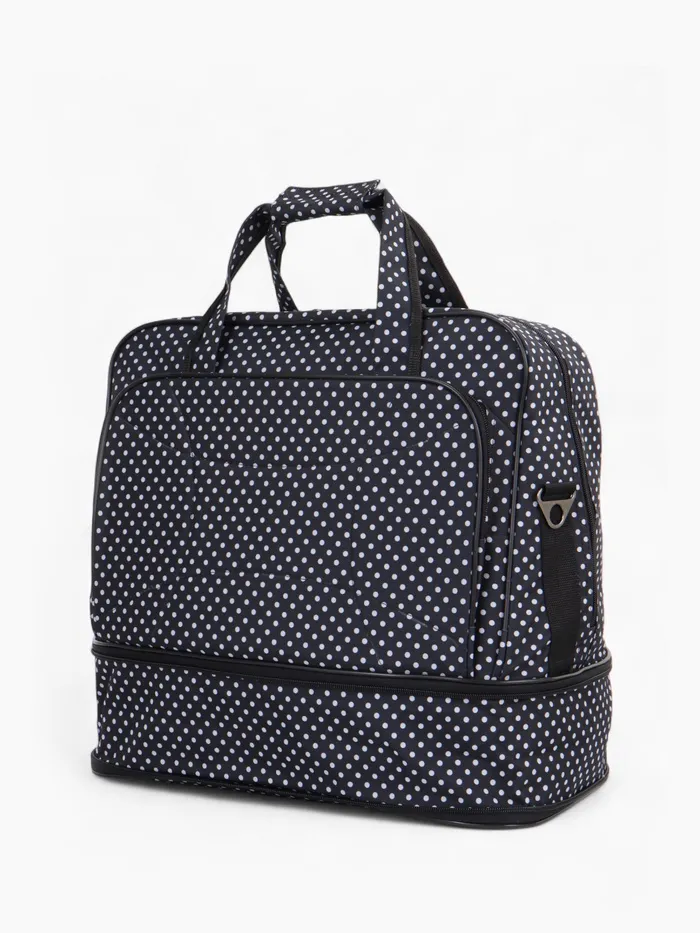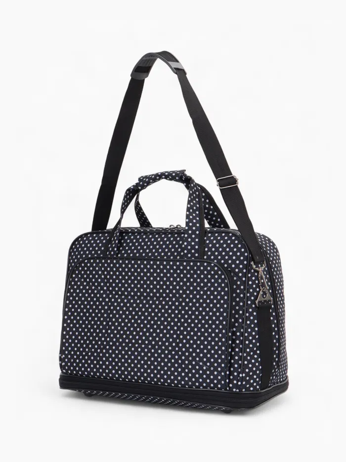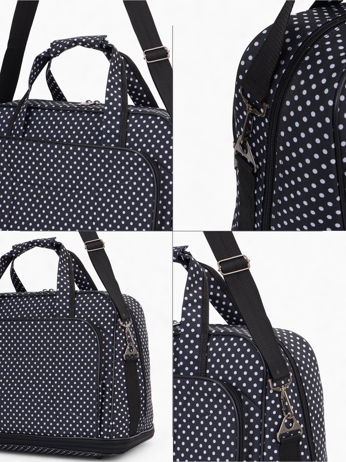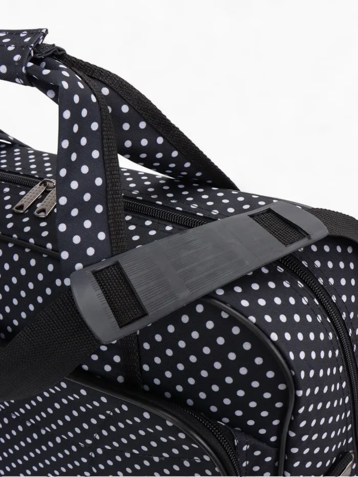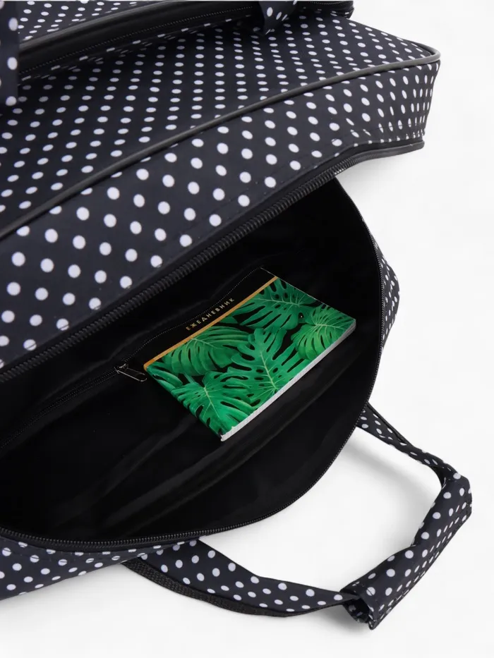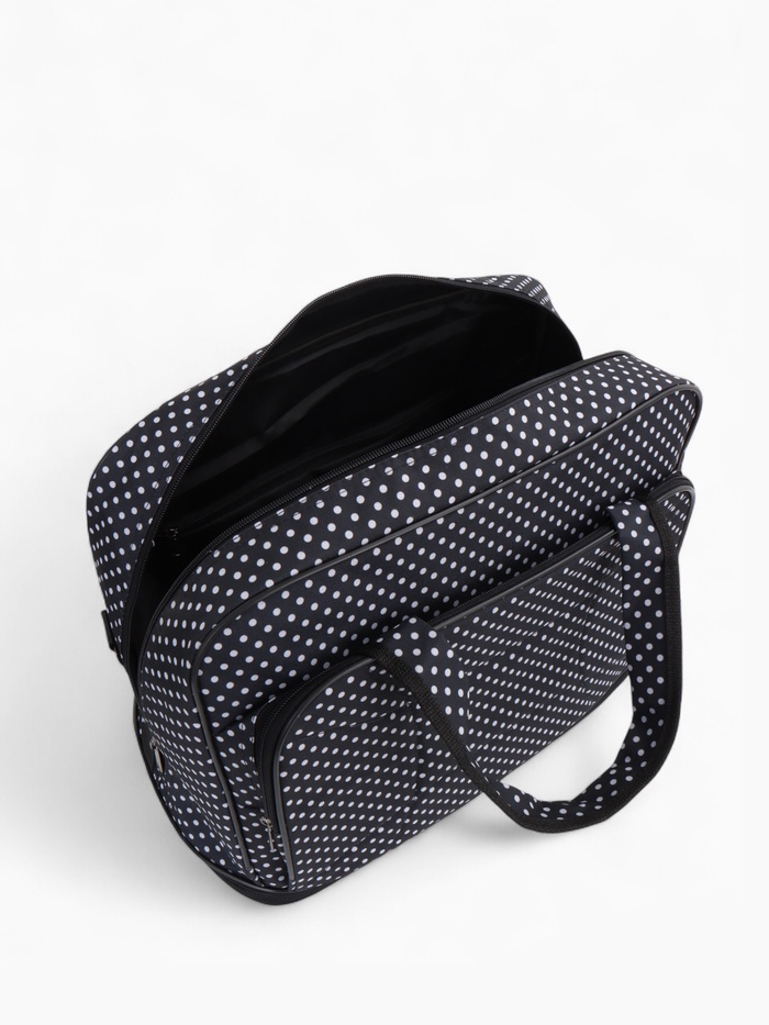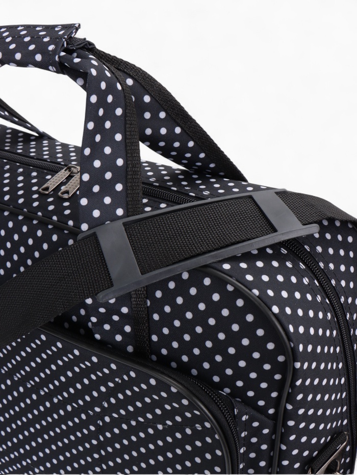 Чёрная сумка в горошек с расширяемым объёмом — стильное решение для повседневной носки и коротких поездок. Длинный регулируемый ремень распределяет нагрузку, а наружный карман держит мелочи под рукой. Система увеличения до 33 литров справляется с внезапными покупками.