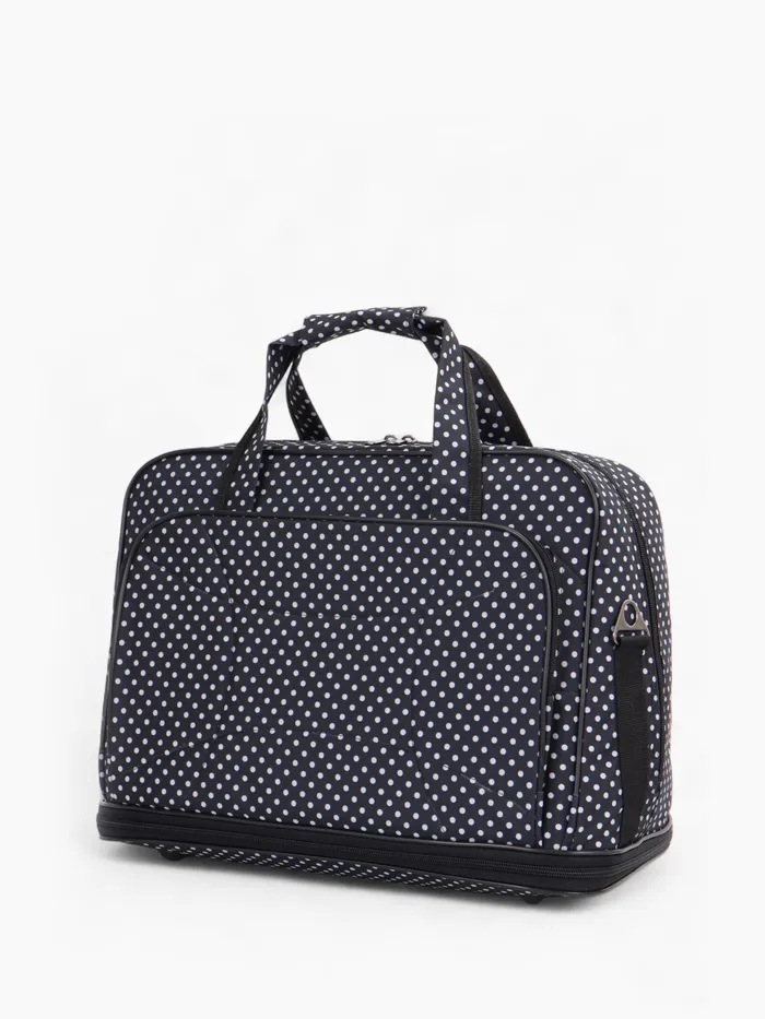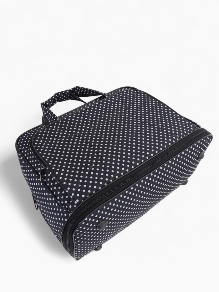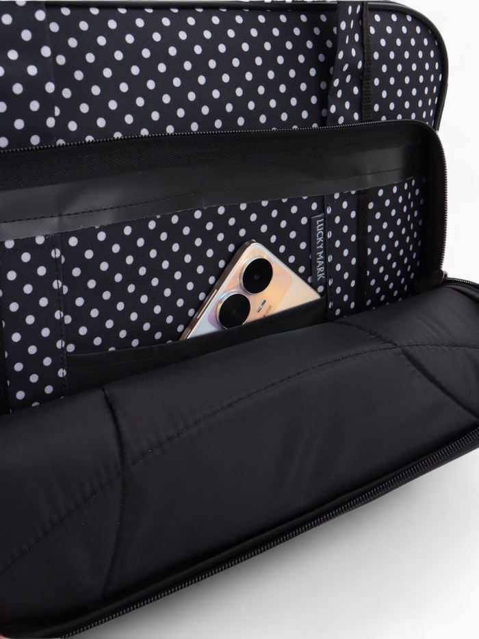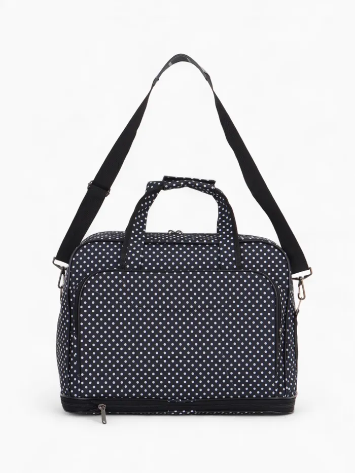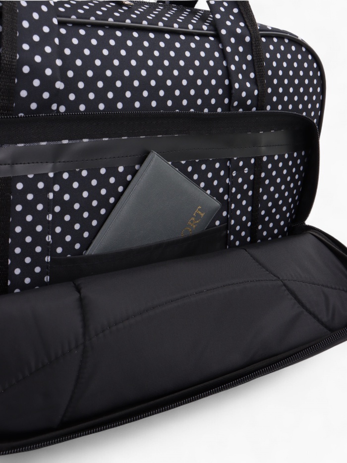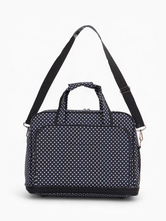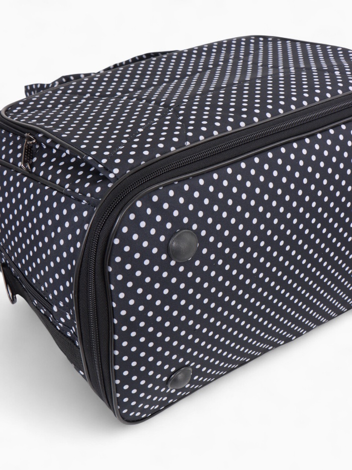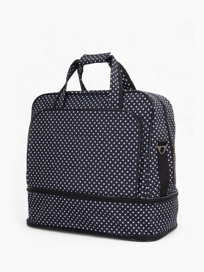 Чёрная сумка в горошек с расширяемым объёмом — стильное решение для повседневной носки и коротких поездок. Длинный регулируемый ремень распределяет нагрузку, а наружный карман держит мелочи под рукой. Система увеличения до 33 литров справляется с внезапными покупками.