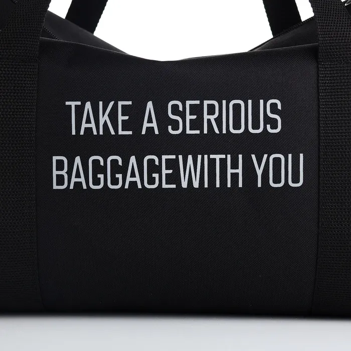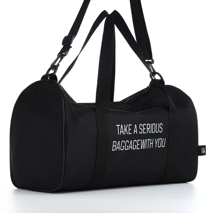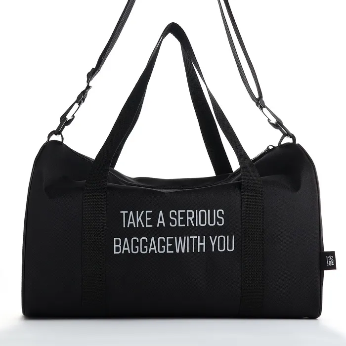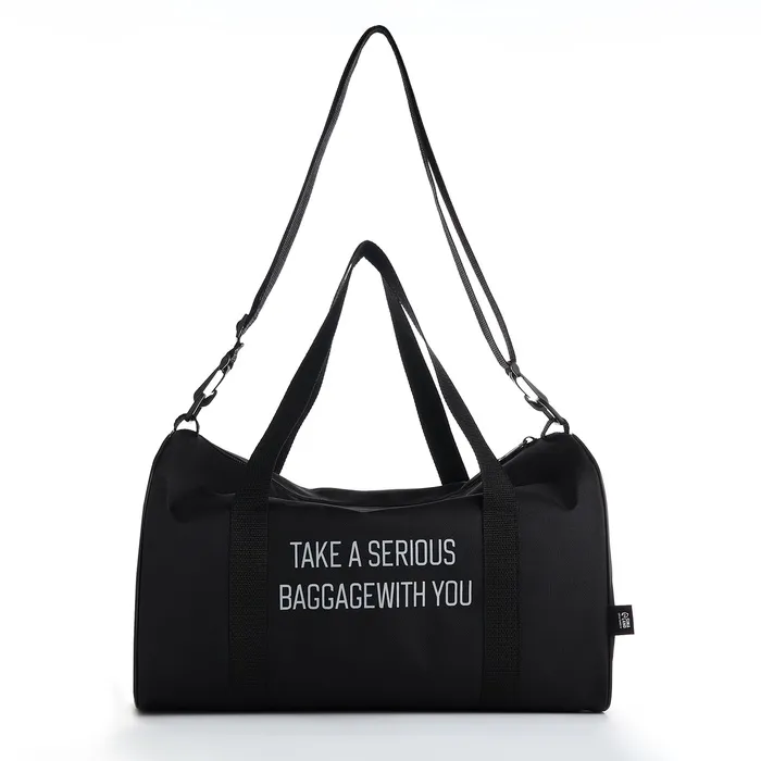 Небольшая дорожная сумка на молнии, выполненная из прочного полиэстера. Компактные размеры: 20 см в ширину, 23 см в высоту и 38 см в длину - делают её идеальной для удобного размещения ваших вещей. Подходит для всех: мужчин и женщин, без ограничений по полу. Практичный чёрный цвет с оригинальным узором из слов и букв добавляет стильности и универсальности. Не имея отделения для обуви и колесиков, эта модель сумки создаёт ощущение лёгкости и мобильности. Отличный выбор для тех, кто ценит комфорт и надежность.
