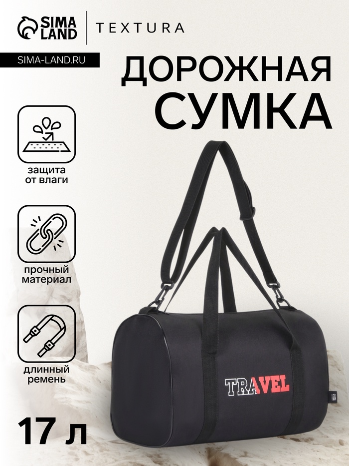 Сумка дорожная на молнии TEXTURA, с подкладкой, длинный ремень, маленький размер, чёрная — Характеристики