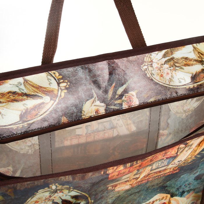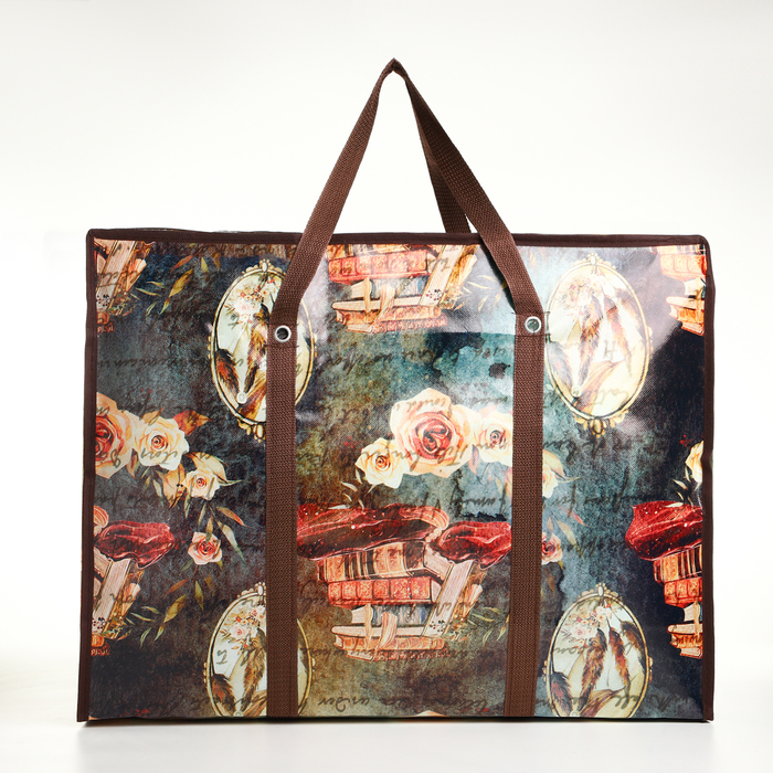 Этот хозяйственный баул сочетает практичность с эстетикой повседневности. Просторное отделение вмещает объёмные покупки, а молния защищает содержимое от выпадения. Коричневый фон с растительным принтом маскирует случайные загрязнения, сохраняя презентабельный вид.