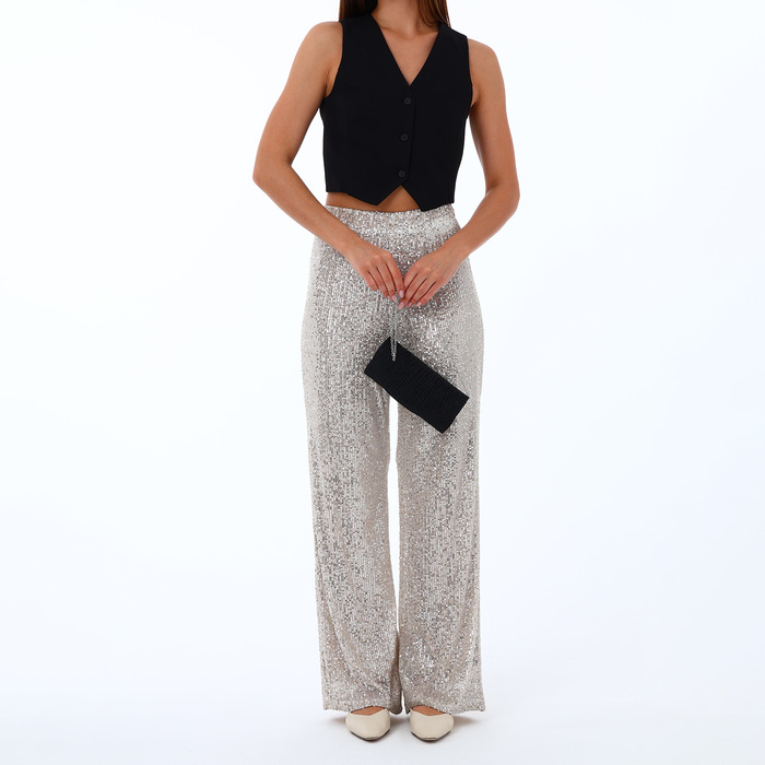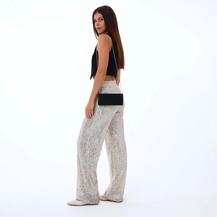 Несмотря на компактные размеры (20×9×5 см), в сумку помещается всё необходимое: телефон, ключи, помада и карточки. Текстильный материал с блестящей отделкой сочетается с вечерними нарядами и коктейльными платьями. Сумка работает в любое время года — её стиль не зависит от сезона.