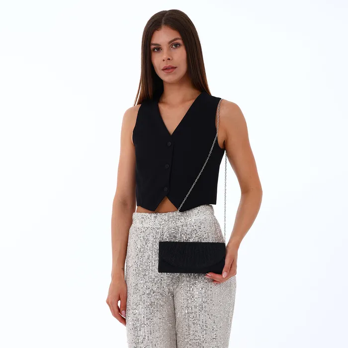 Этот элегантный клатч станет завершающим акцентом вашего вечернего образа. Компактная чёрная сумка на серебристой цепочке подходит для особых случаев — от новогоднего банкета до летней вечеринки.