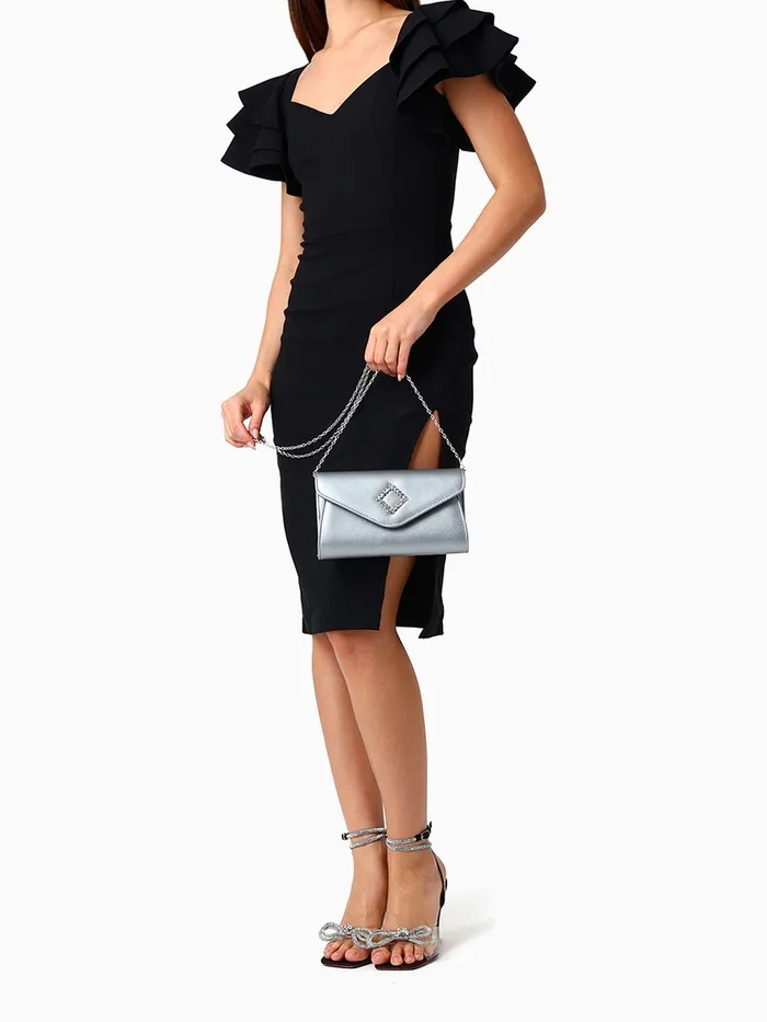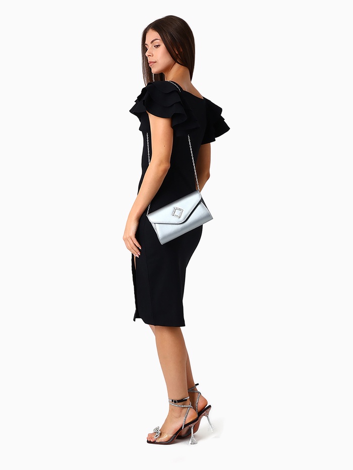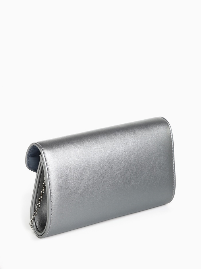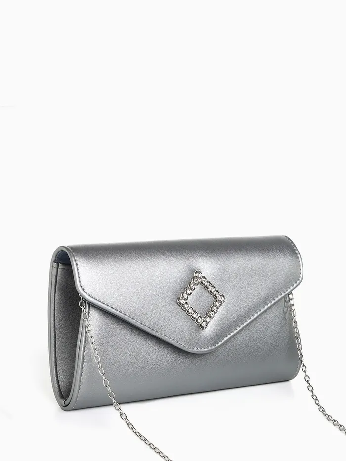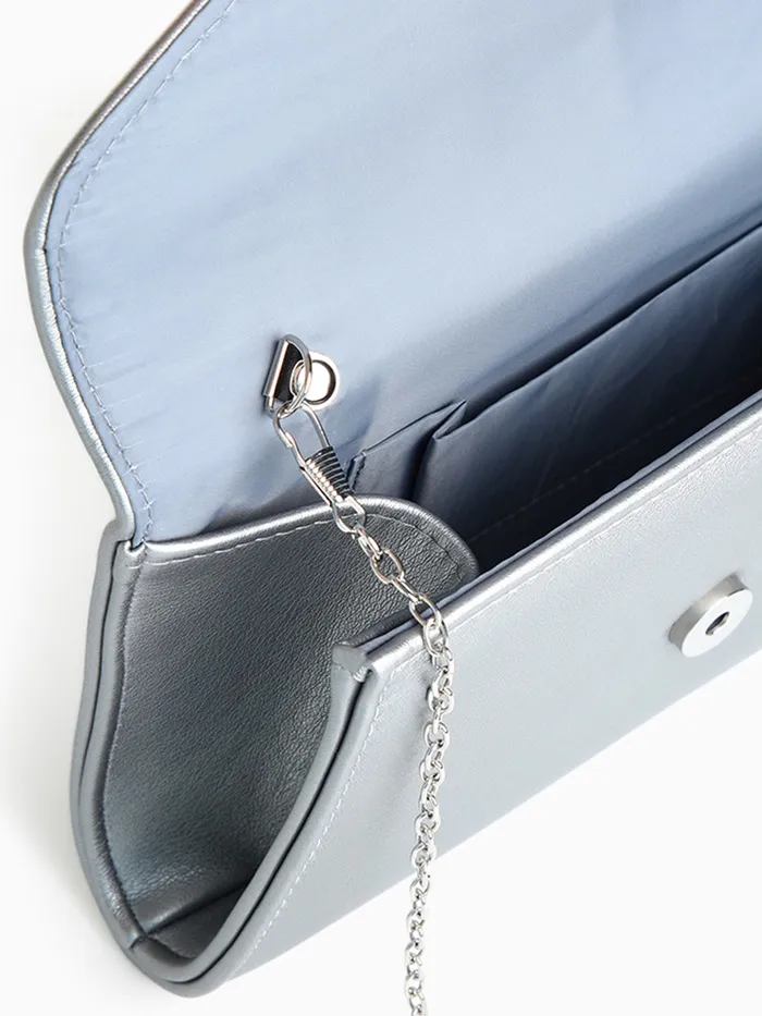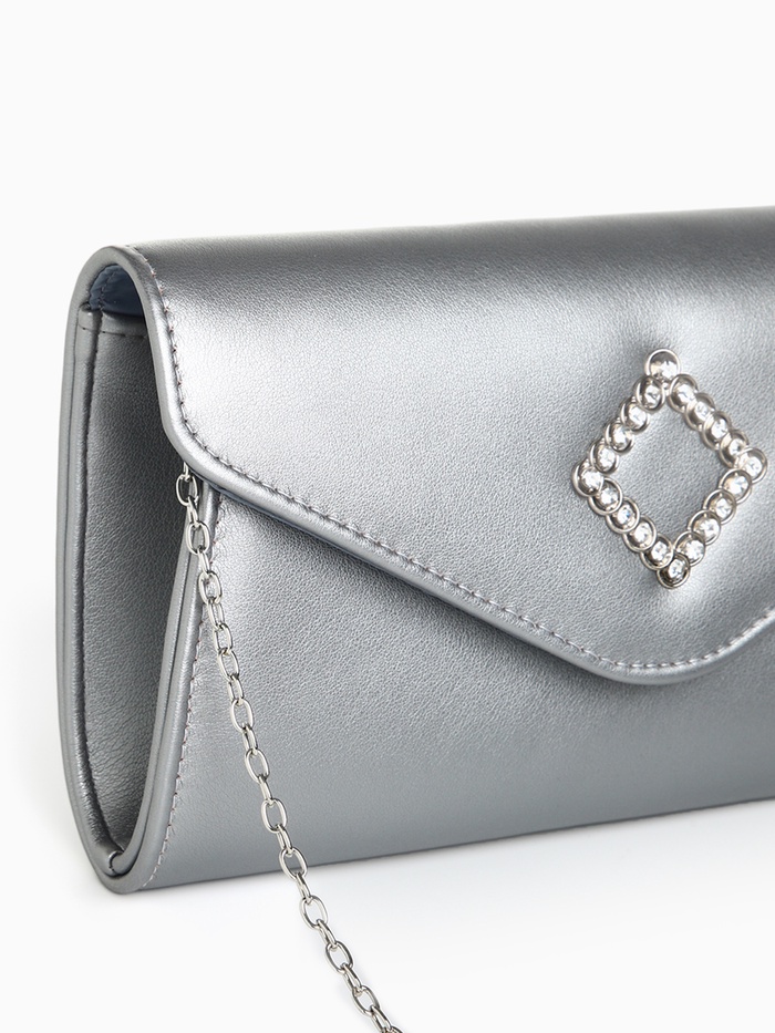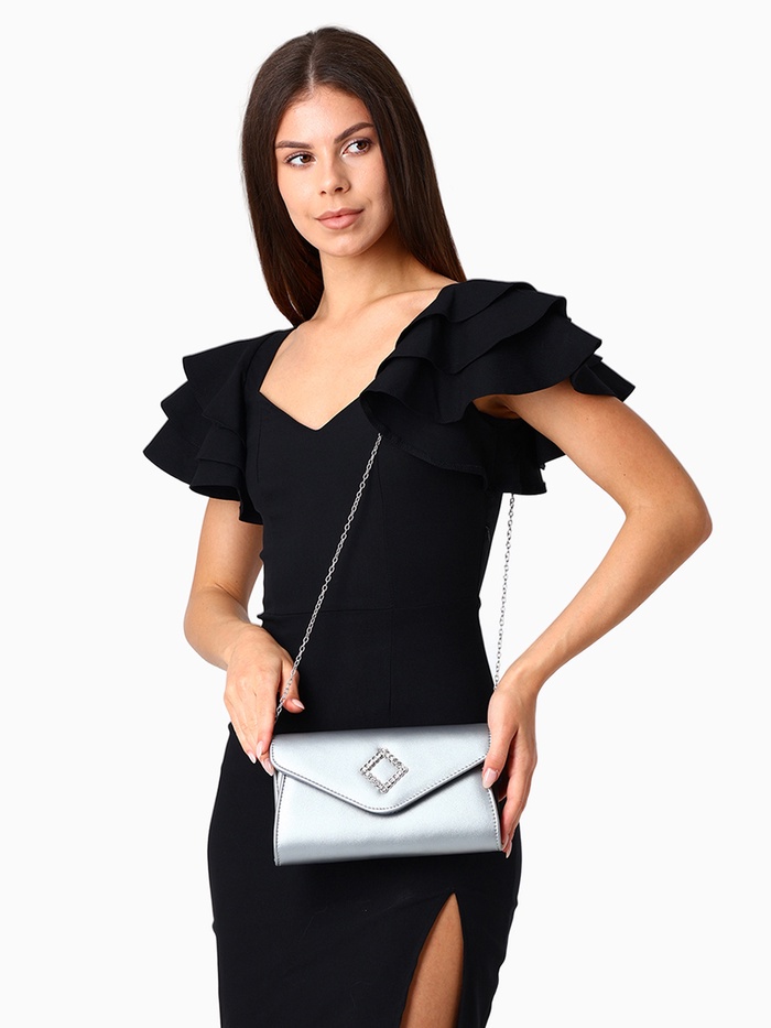 Сумка-клатч женская вечерняя на магните, на длинной цепочке, с декоративным элементом, однотонная, серебристая — Характеристики