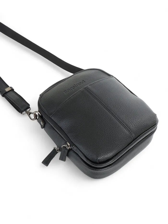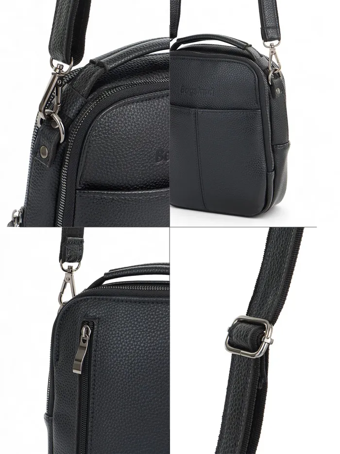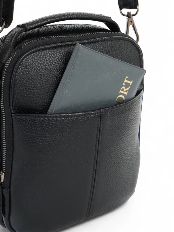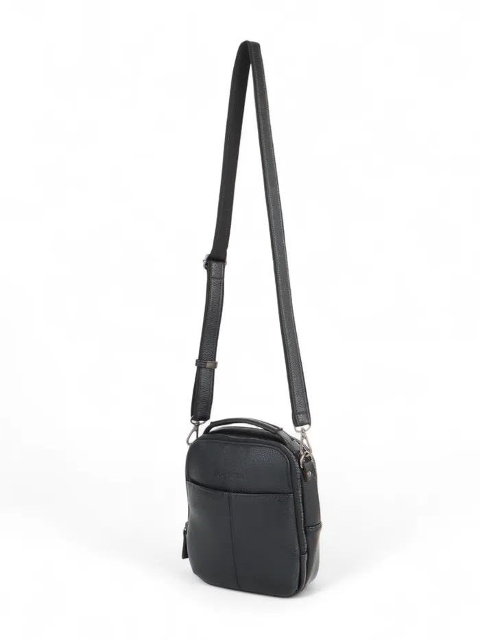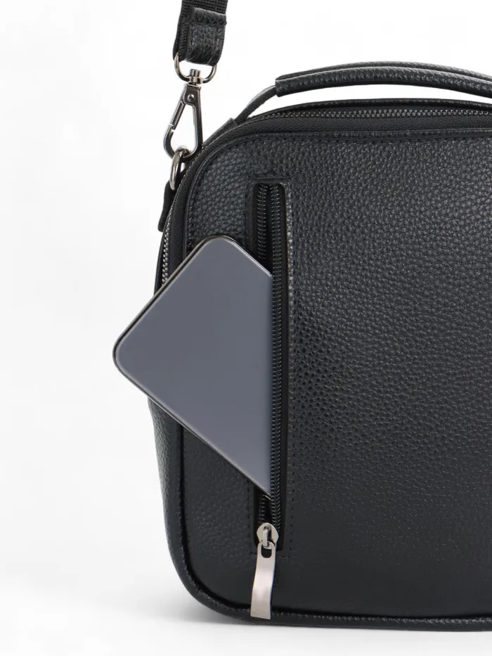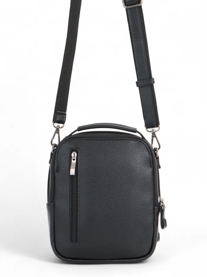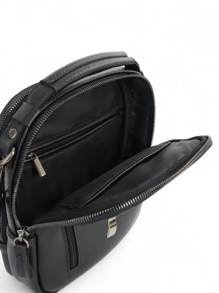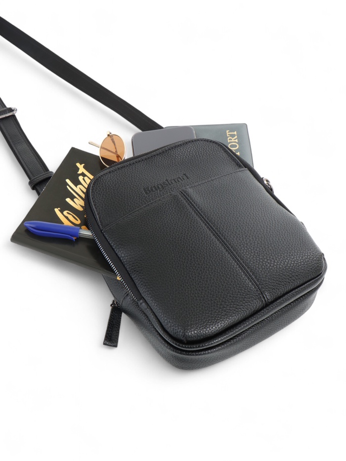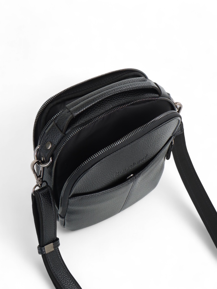 Чёрный кожаный кросс-боди с молнией — компактный и функциональный аксессуар для мужчин. Лёгкая полукаркасная конструкция держит форму. Длинный регулируемый ремень даёт свободу: носите сумку через плечо или в руке, когда нужен быстрый доступ к вещам.
