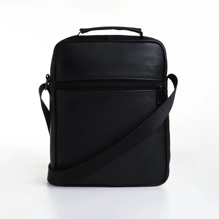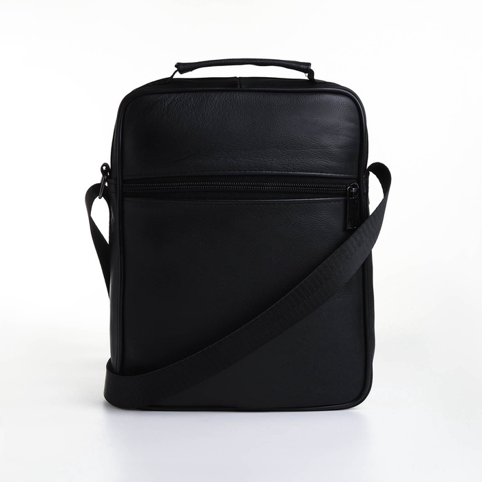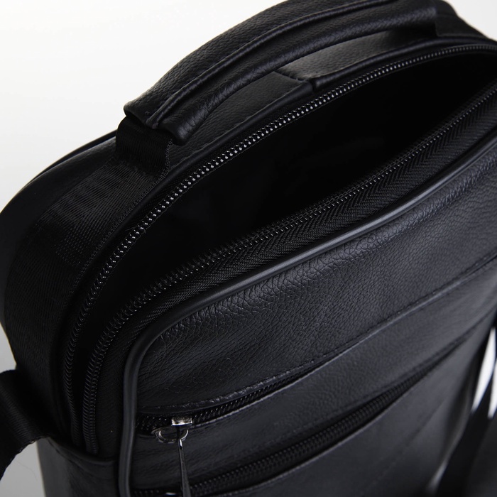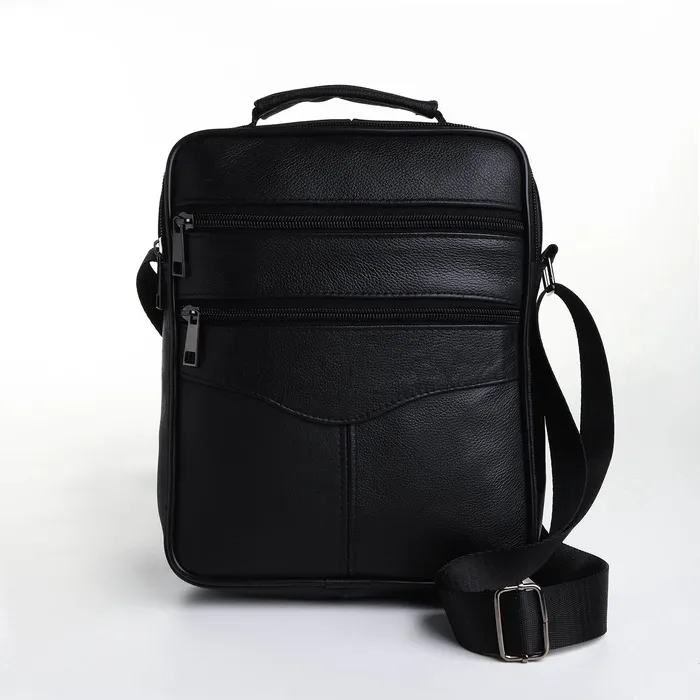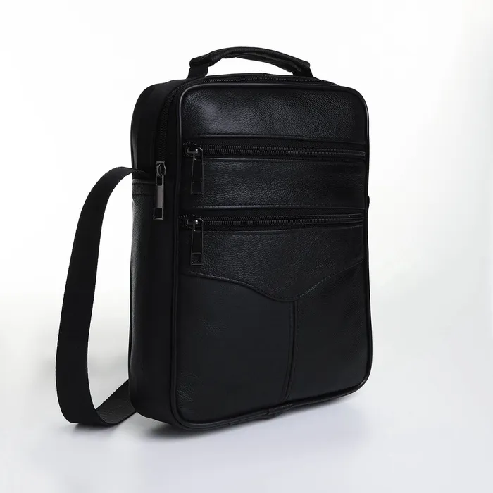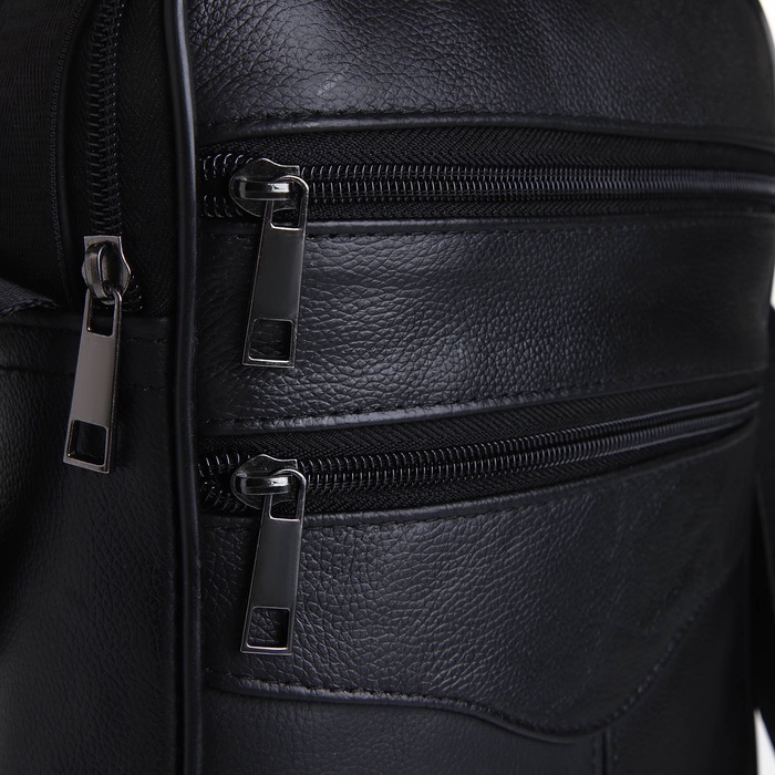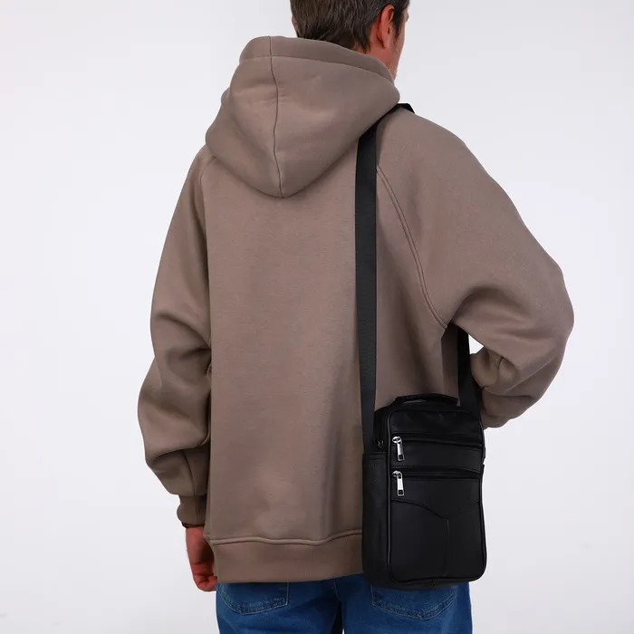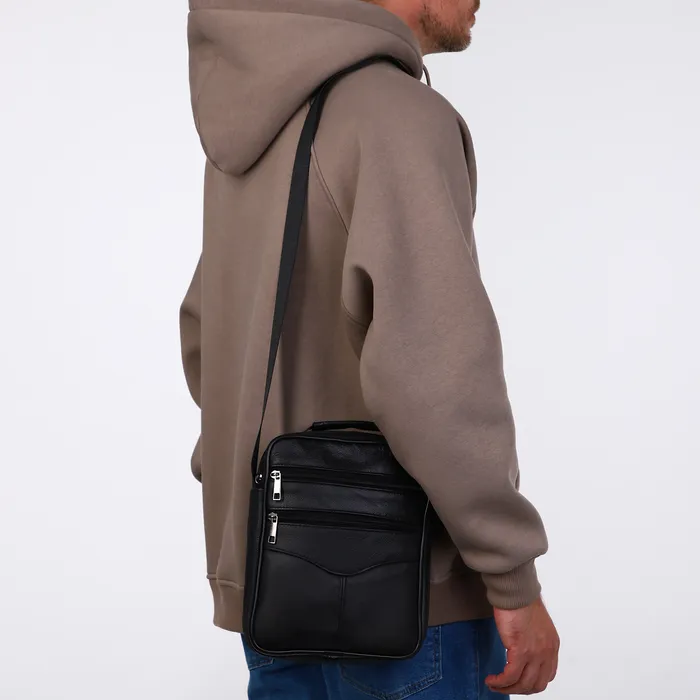 Сумка мужская, на молнии, через плечо, с длинным ремнём, прессованная кожа, 3 наружных кармана, чёрная — Характеристики