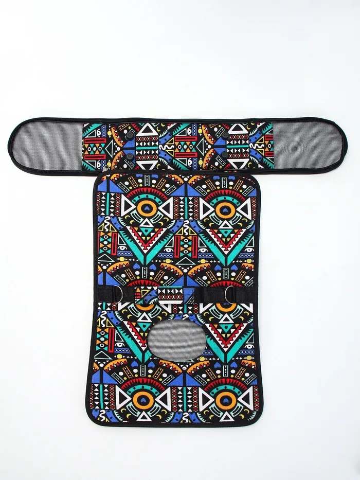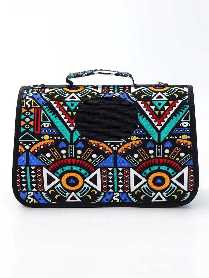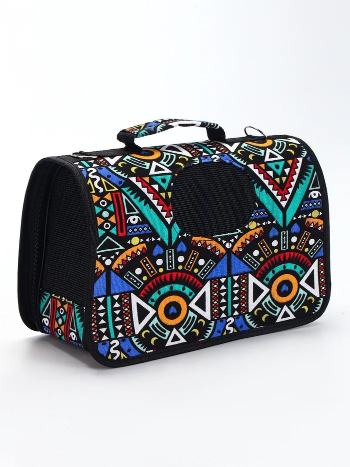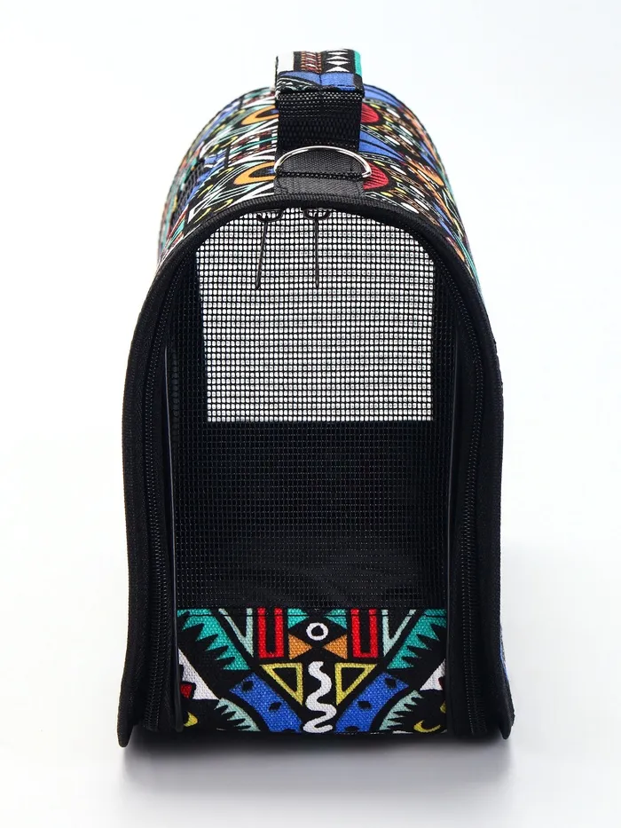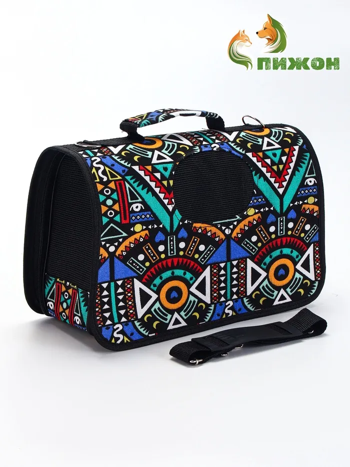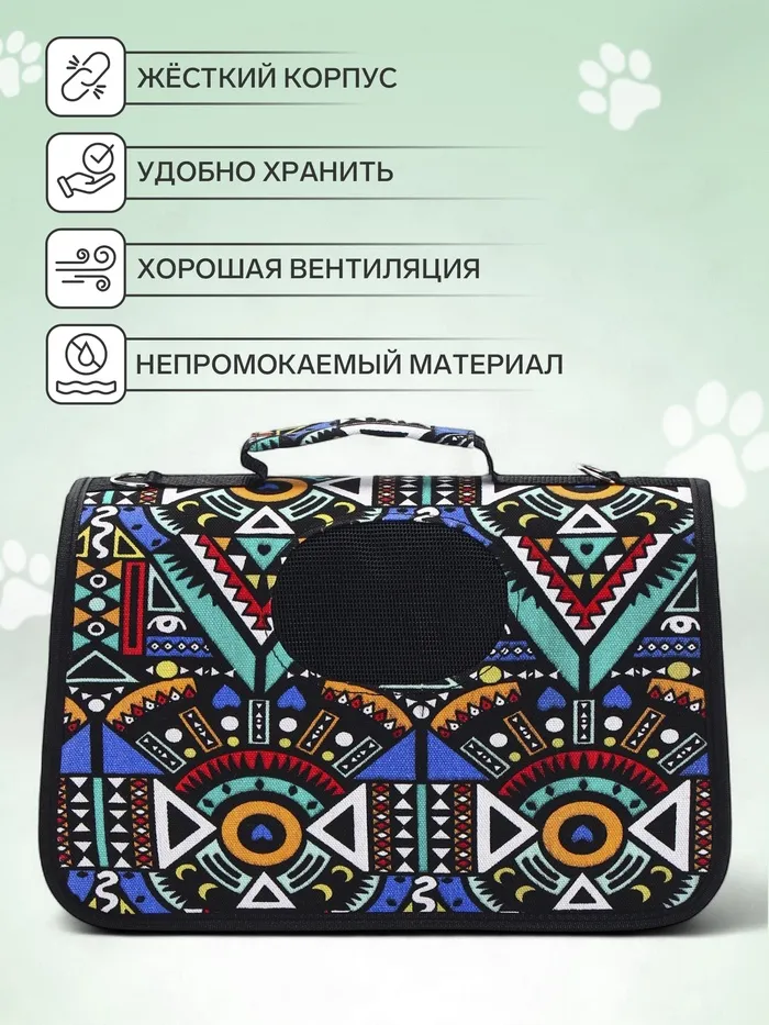 - Яркий разноцветный дизайн с рисунком выделяет переноску среди других.