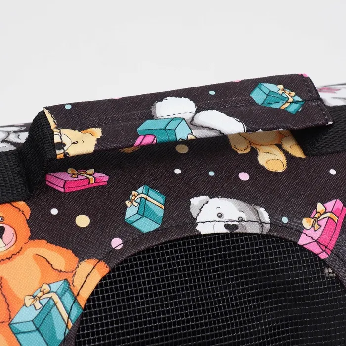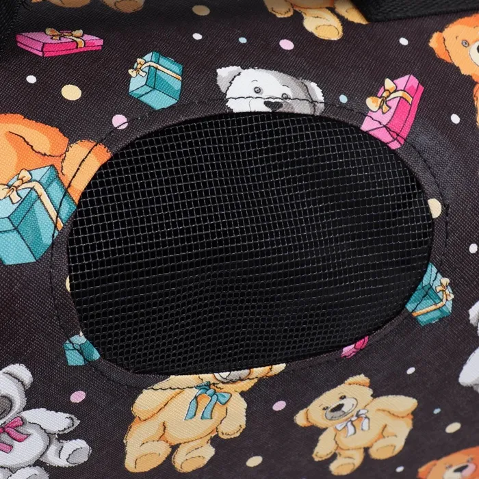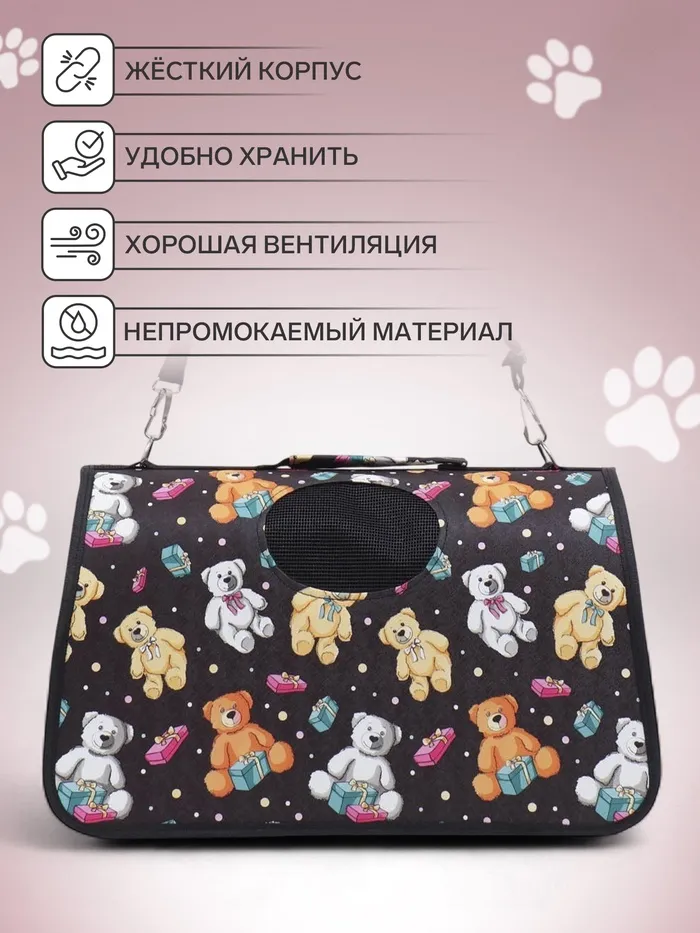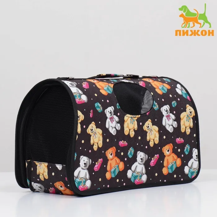 Каркасная переноска с изображением медведей на черном фоне создана для комфортных путешествий с питомцем. Этот аксессуар обеспечивает безопасность и удобство во время перемещений.