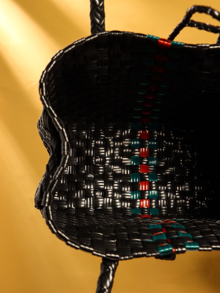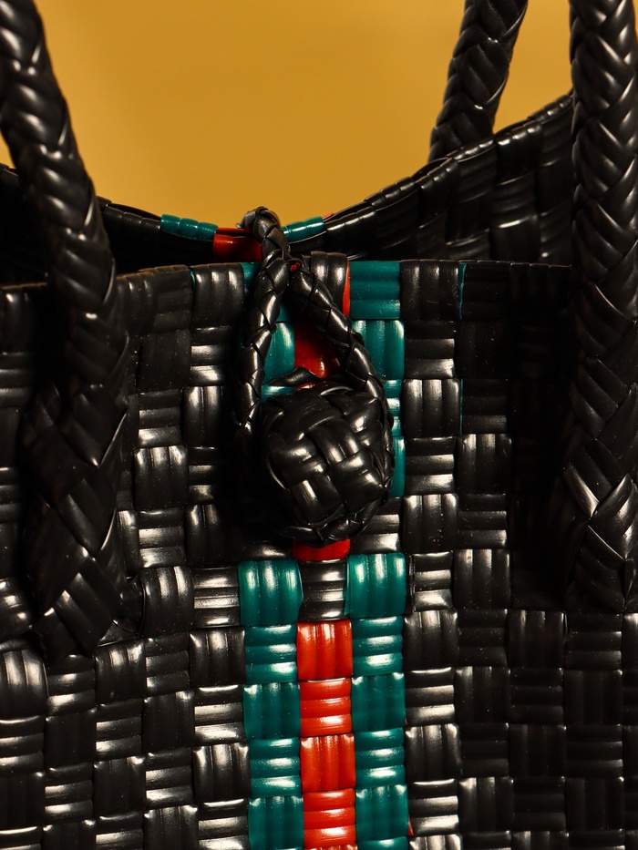 Плетёная пластиковая сумка классического черного цвета. Компактный размер делает её универсальным аксессуаром для любого сезона. Надёжная застёжка на пуговицу обеспечивает сохранность содержимого. Прочная пластиковая конструкция сочетает лёгкость и долговечность.