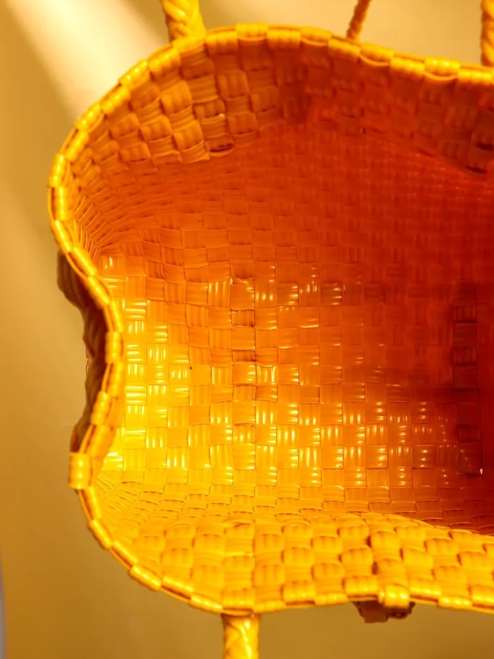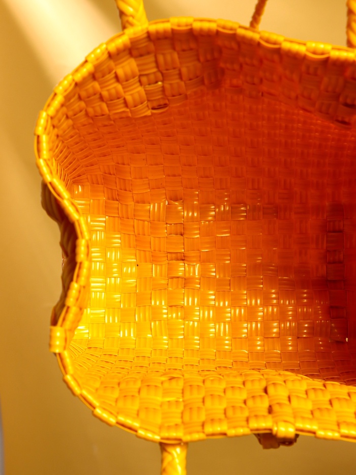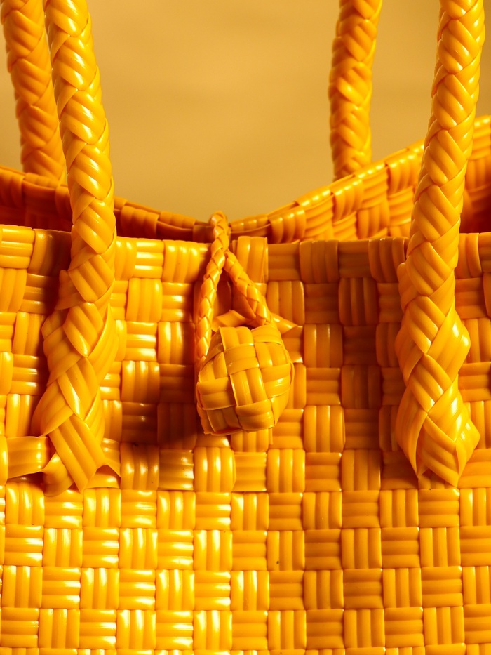 Плетёная пластиковая сумка яркого жёлтого цвета. Компактный размер делает её идеальным летним аксессуаром. Застёжка на пуговицу обеспечивает быстрый доступ к необходимым вещам. Лёгкая и прочная конструкция из пластика.