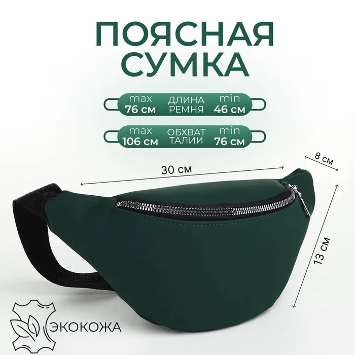 Сумка поясная на молнии, цвет зелёный — Характеристики