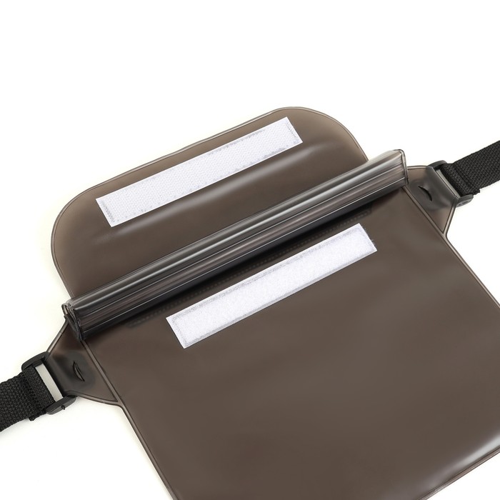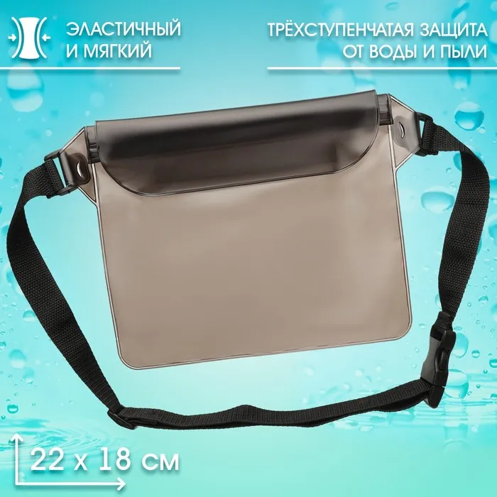 Сумка изготовлена из мягкого ПВХ и оснащена четырмя этапами защиты: три застежки типа zip lock и фиксация зип-замков в скрученном состоянии с помощью липучки - за счет этого обеспечивается защита содержимого от воды. Прозрачность материала позволяет пользоваться сенсорным экраном смартфона, не вынимая его из сумки.