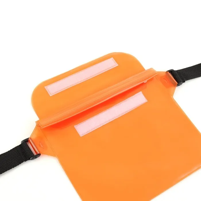 Сумка изготовлена из мягкого ПВХ и оснащена четырмя этапами защиты: три застежки типа zip lock и фиксация зип-замков в скрученном состоянии с помощью липучки - за счет этого обеспечивается защита содержимого от воды. Прозрачность материала позволяет пользоваться сенсорным экраном смартфона, не вынимая его из сумки.