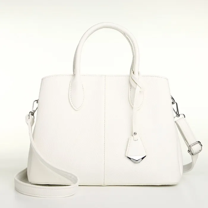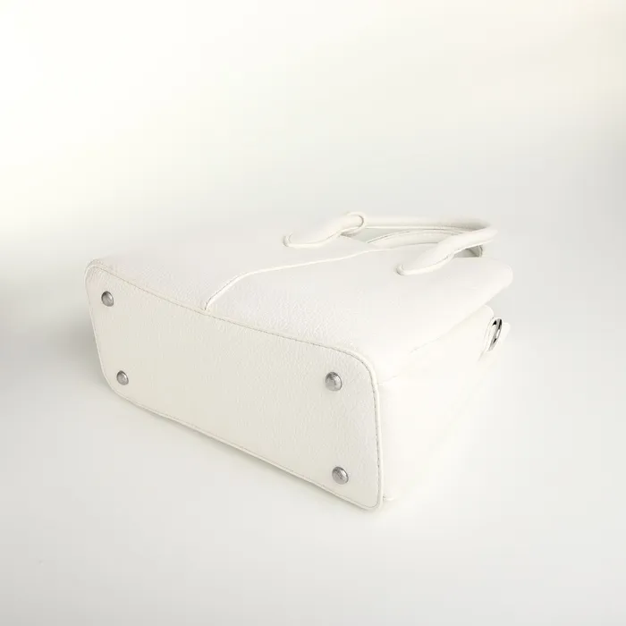 Сумка оснащена прочной молнией и имеет жесткий каркас, что обеспечивает сохранность ваших вещей. Благодаря длинному ремешку и коротким ручкам, вы сможете носить ее как на плече, так и в руке, что добавляет дополнительного комфорта. Белый цвет и серебряная фурнитура придают аксессуару свежий и современный вид, делая его подходящим для любого сезона.