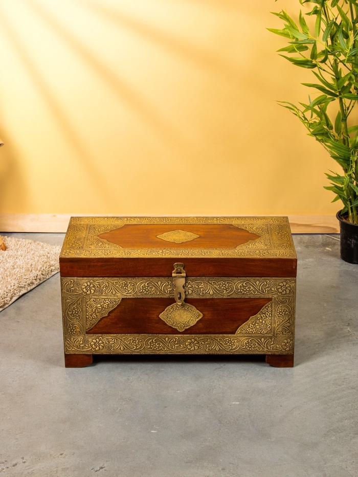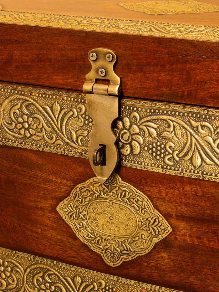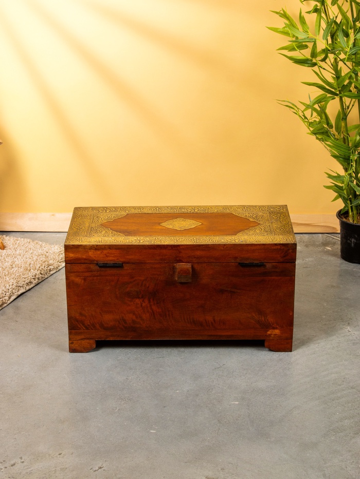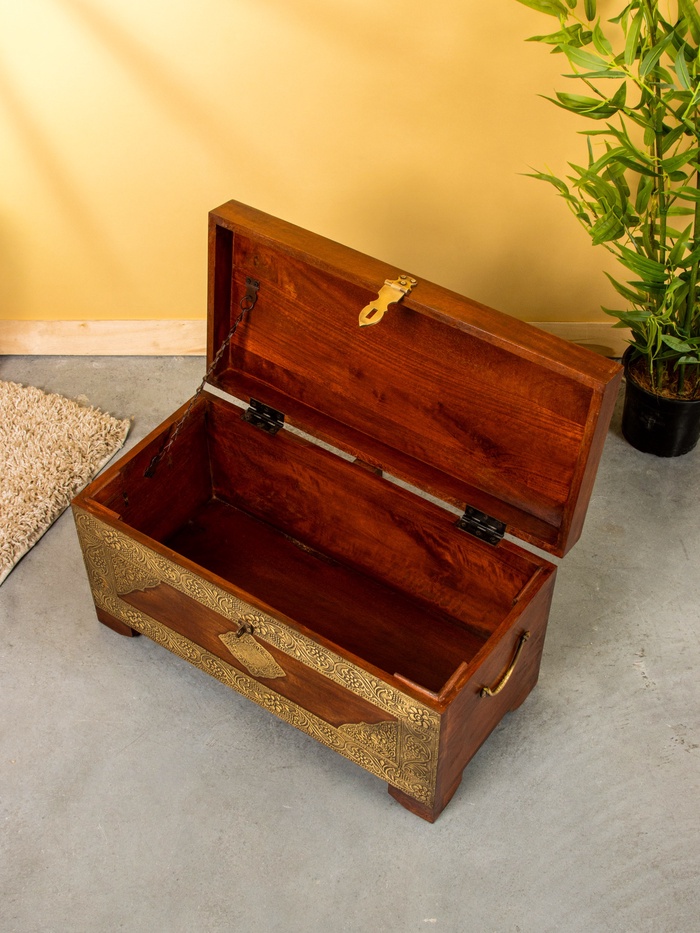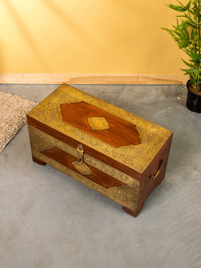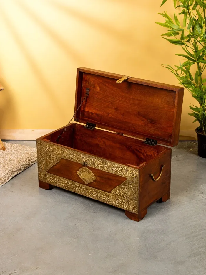 Компактный деревянный сундук с латунными элементами – идеальное решение для хранения в небольших пространствах. Габариты 64×30×33 см позволяют удобно разместить его у кровати, в прихожей или даже под столом. Натуральное дерево в оттенке венге с золотистыми акцентами придает интерьеру благородный шарм. Глубокий внутренний отсек вмещает книги, аксессуары или постельное белье, а прочная конструкция гарантирует долгий срок службы.