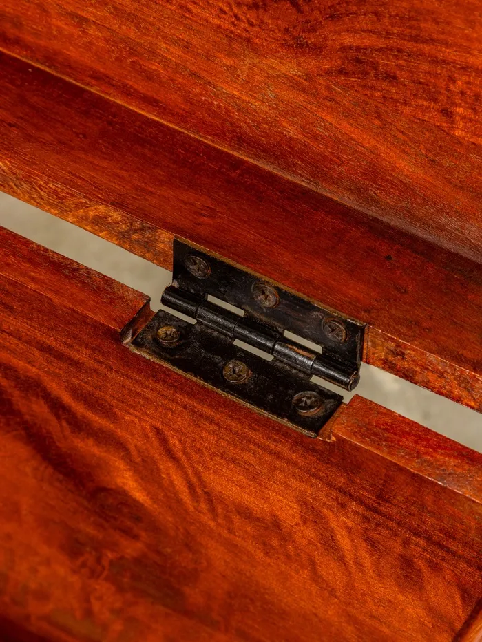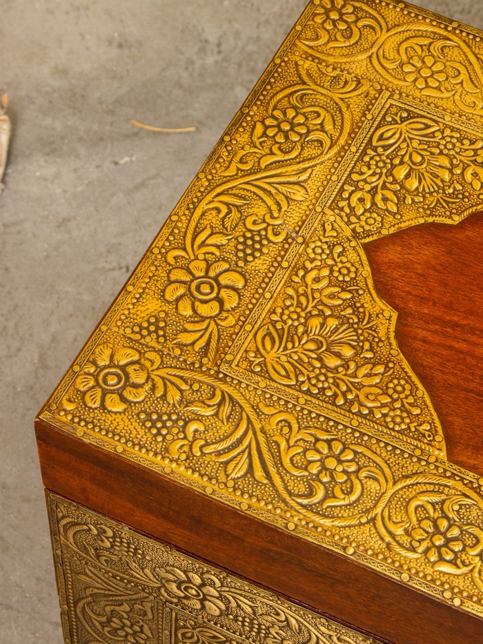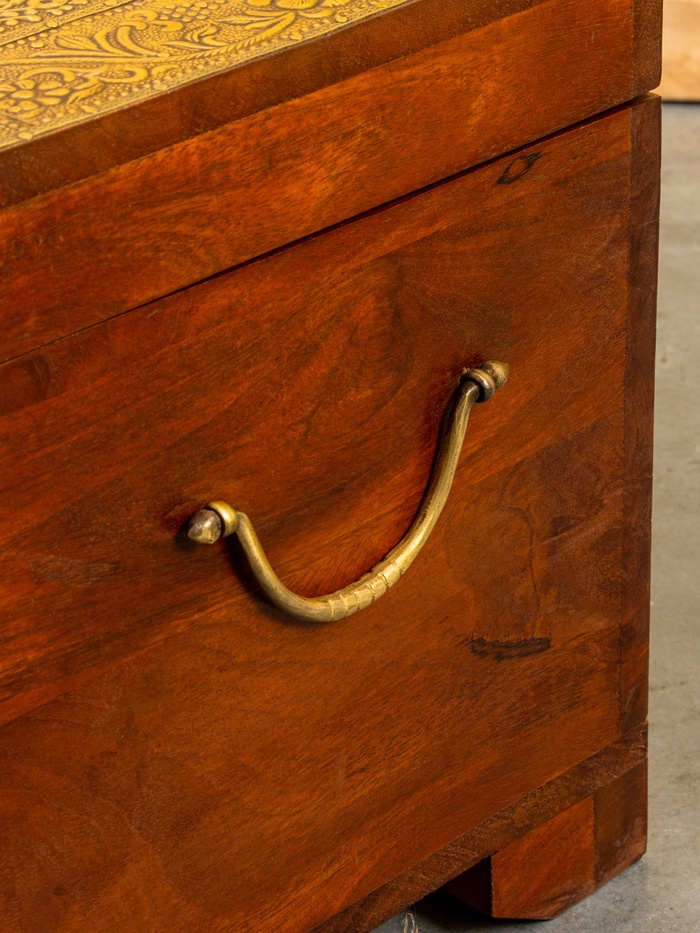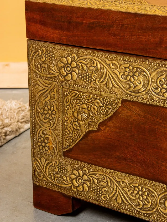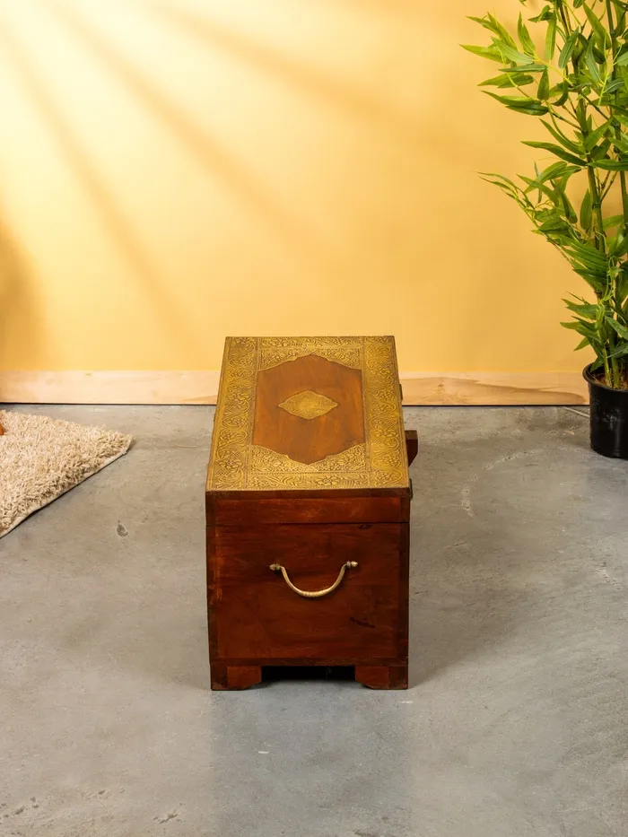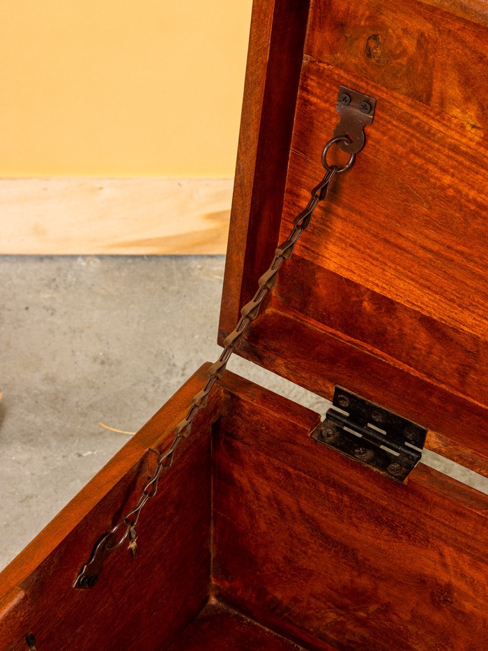 Компактный деревянный сундук с латунными элементами – идеальное решение для хранения в небольших пространствах. Габариты 64×30×33 см позволяют удобно разместить его у кровати, в прихожей или даже под столом. Натуральное дерево в оттенке венге с золотистыми акцентами придает интерьеру благородный шарм. Глубокий внутренний отсек вмещает книги, аксессуары или постельное белье, а прочная конструкция гарантирует долгий срок службы.