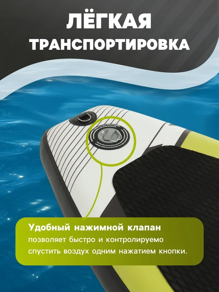 - Запирающийся нажимной клапан с защитой от повреждений обеспечивает герметичность. Кнопочная система помогает без труда приспустить давление в доске нажатием на кнопку в клапане.