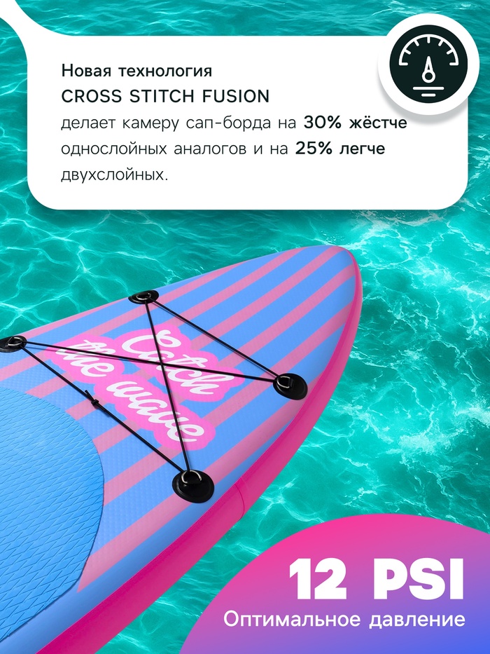 - Новая технология соединений в камере высокого давления — CROSS STITCH FUSION (вышивка крестом). На 30 % жёстче по сравнению с обычными однослойными камерами сапбордов. На 25 % легче по сравнению с устоявшейся технологией изготовления двойного слоя.