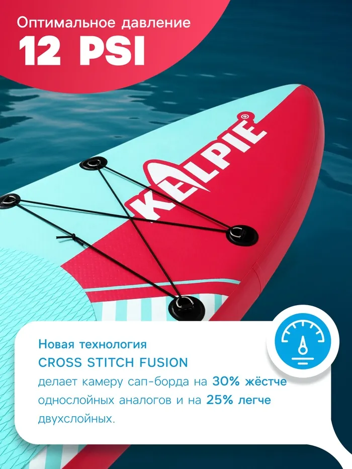 - Новая технология соединений в камере высокого давления — CROSS STITCH FUSION (вышивка крестом). На 30% жёстче по сравнению с обычными однослойными камерами сап-бордов. На 25% легче по сравнению с устоявшейся технологией изготовления двойного слоя.