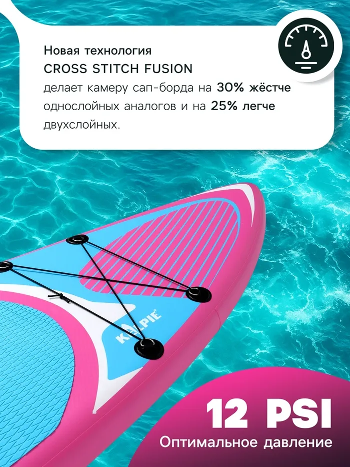 - Новая технология соединений в камере высокого давления — CROSS STITCH FUSION (вышивка крестом). На 30% жёстче по сравнению с обычными однослойными камерами сап-бордов. На 25% легче по сравнению с устоявшейся технологией изготовления двойного слоя.