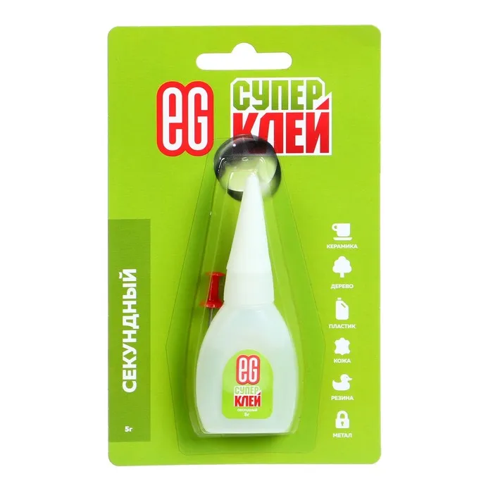 Клей за считанные секунды склеивает металл, пластик, фарфор, дерево, картон, резину, кожу и многие другие материалы.