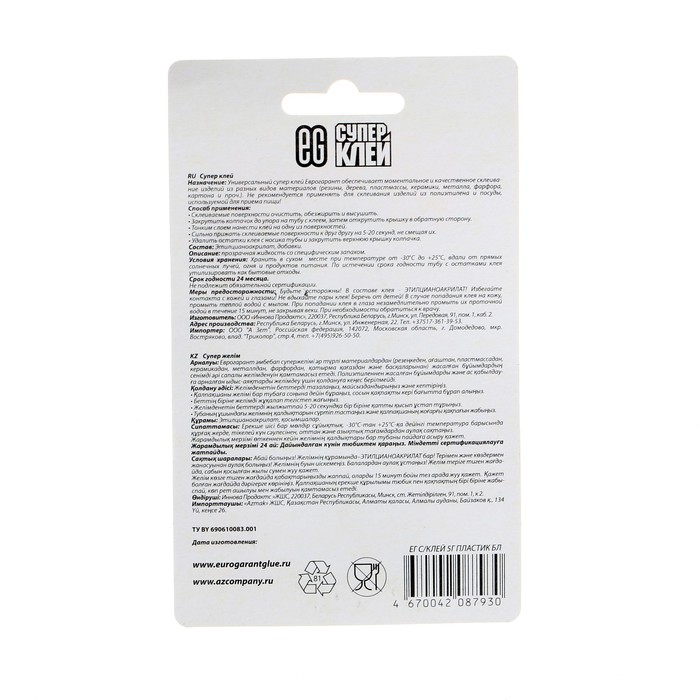 Клей EG Еврогарант секундный обладает всеми соответствующими сертификатами, изделия полностью соответствуют международным и российским государственным стандартам.