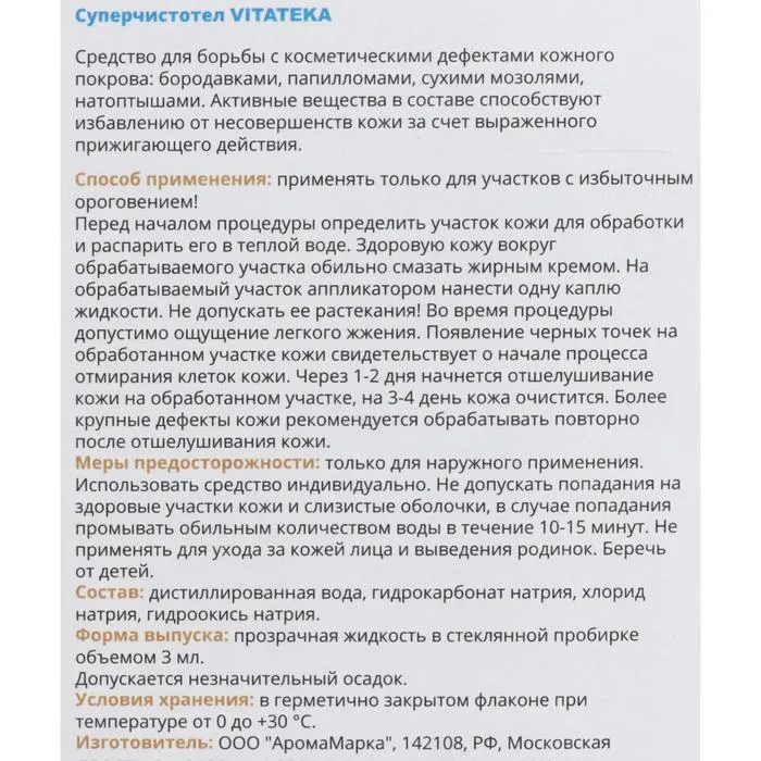 Средство для борьбы с косметическими дефектами кожного покрова: бородавками, папилломами, сухими мозолями, натоптышами. Активные вещества в составе способствуют избавлению от несовершенств кожи за счет выраженного прижигающего действия.