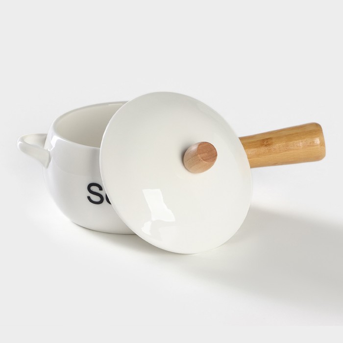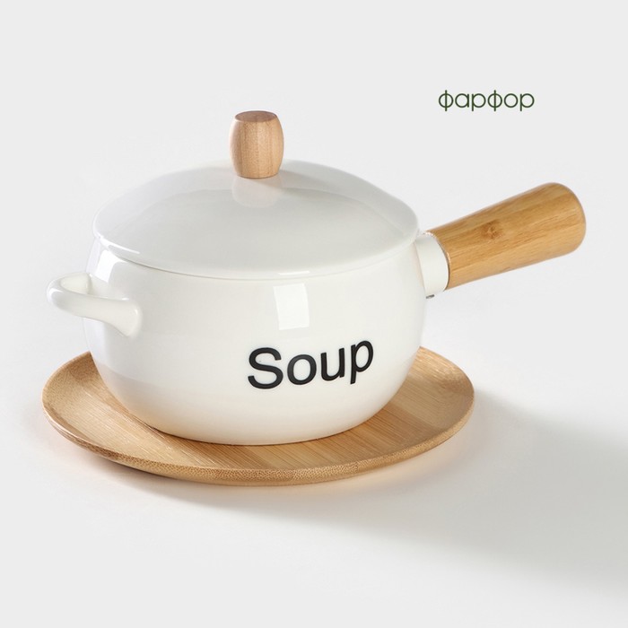 Супница BellaTenero, 400 мл, 20.5×11.5×6.5 см, с ручкой, на бамбуковой подставке, фарфор, белая — Характеристики