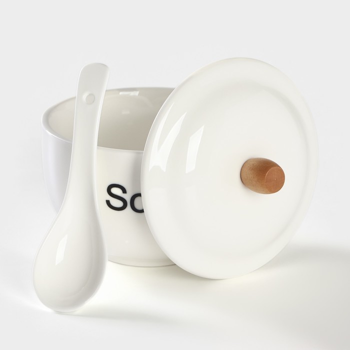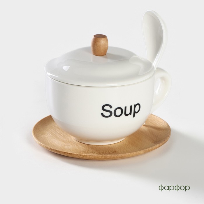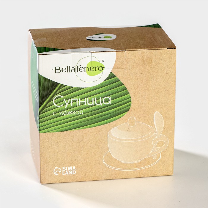 Супница BellaTenero, 450 мл, 15×11.5×7.5 см, с ложкой, на бамбуковой подставке, фарфор, белая — Характеристики