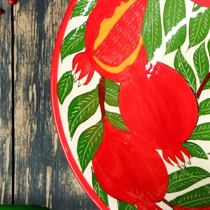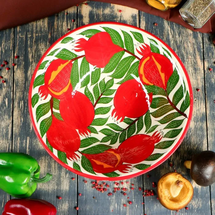 Глубокая керамическая миска ручной работы станет центральным элементом на вашем столе. Её форма и яркий фруктовый орнамент создают атмосферу уюта и изобилия. Белое основание с красными акцентами подчёркивает насыщенность рисунка, делая посуду заметной и эстетичной.