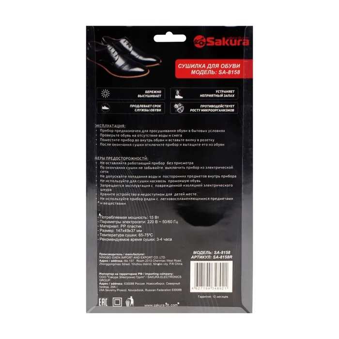 Сушилка для обуви Sakura SA-8158, 75°С, пластик, красный — Характеристики