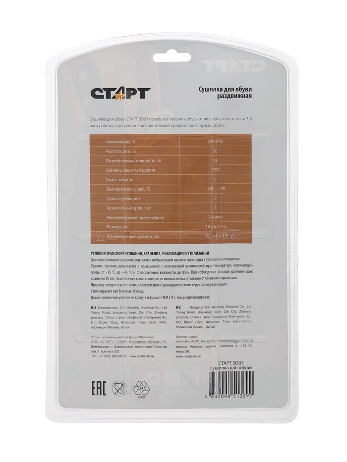 Сушилка для обуви СТАРТ SD 07, 12 Вт, от 18 до 19.5 см, электрическая, раздвижная, синяя — Характеристики